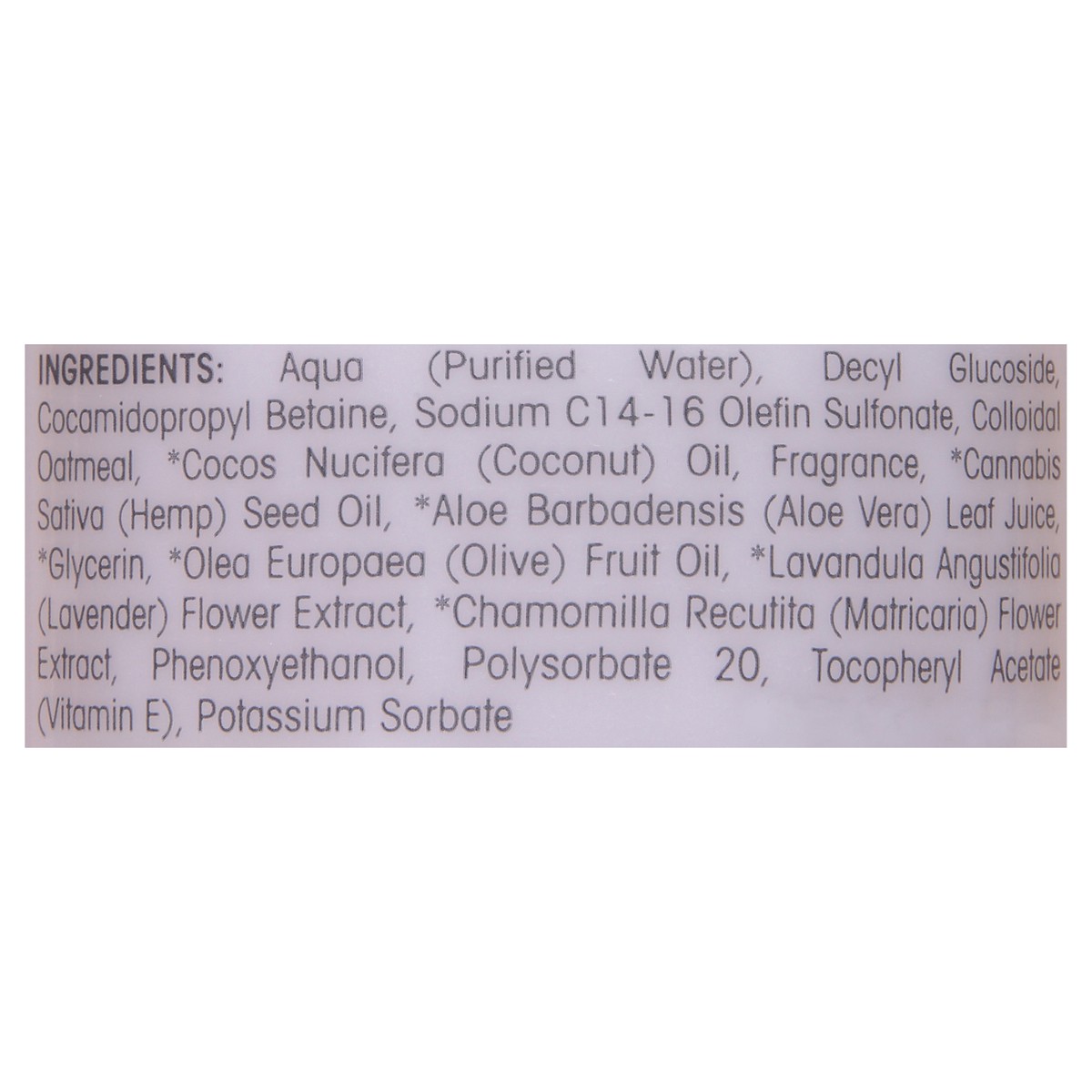Aqua (Purified Water), Decyl Glucoside, Cocamidopropyl Betaine, Sodium C14-16 Olefin Sulfonate, Colloidal Oatmeal, Cocos Nucifera (Coconut) Oil (USDA Certified Organic), Fragrance, Cannabis Sativa (He…