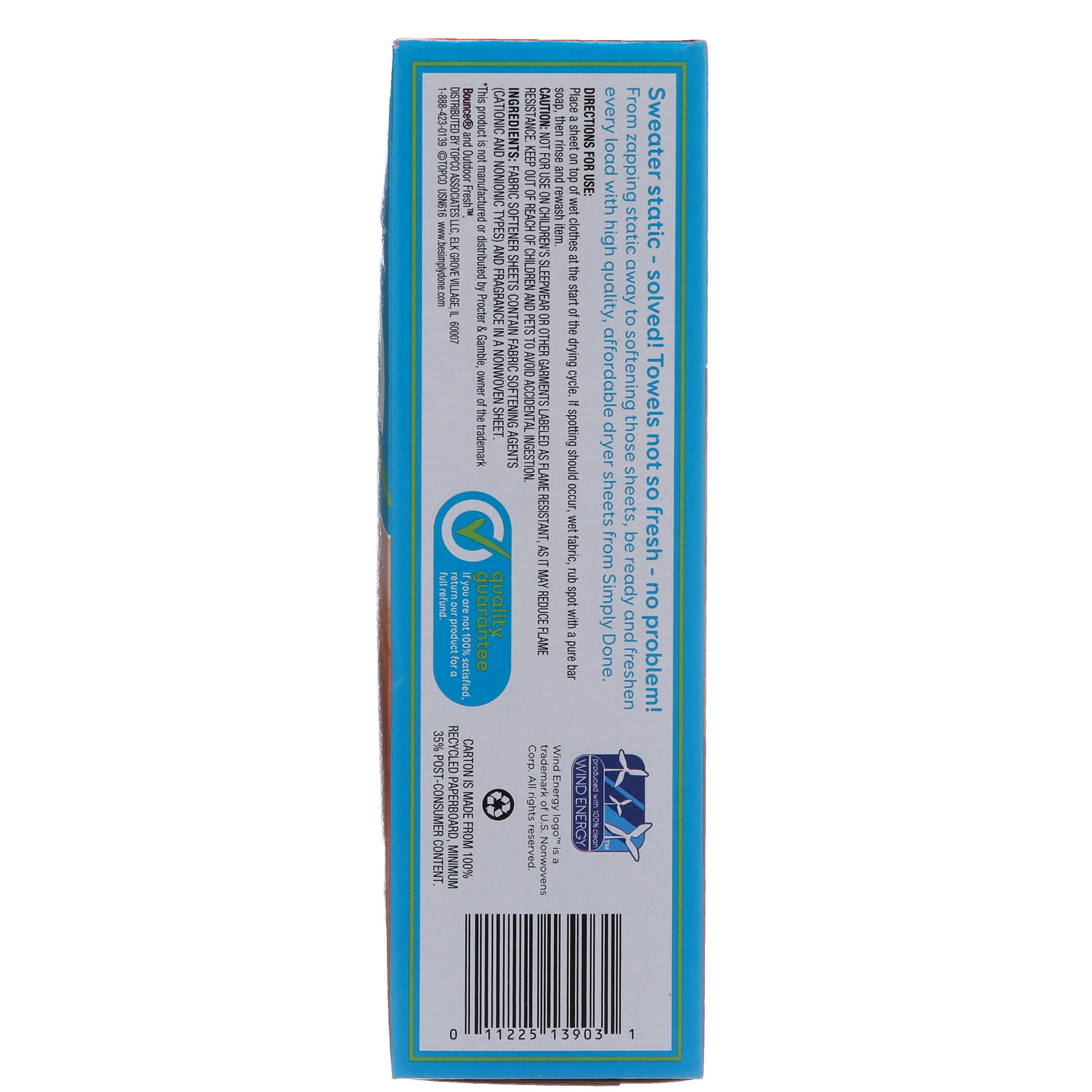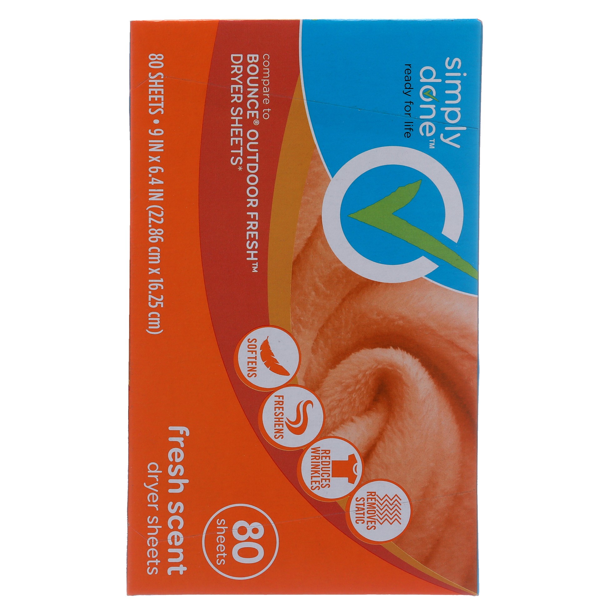 9 in x 6.4 in (22.86 cm x 16.25 cm). Ready for life. Softens. Freshens. Reduces wrinkles. Removes static. Compare to Bounce Outdoor Fresh Dryer Sheets (This product is not manufactured or distributed …