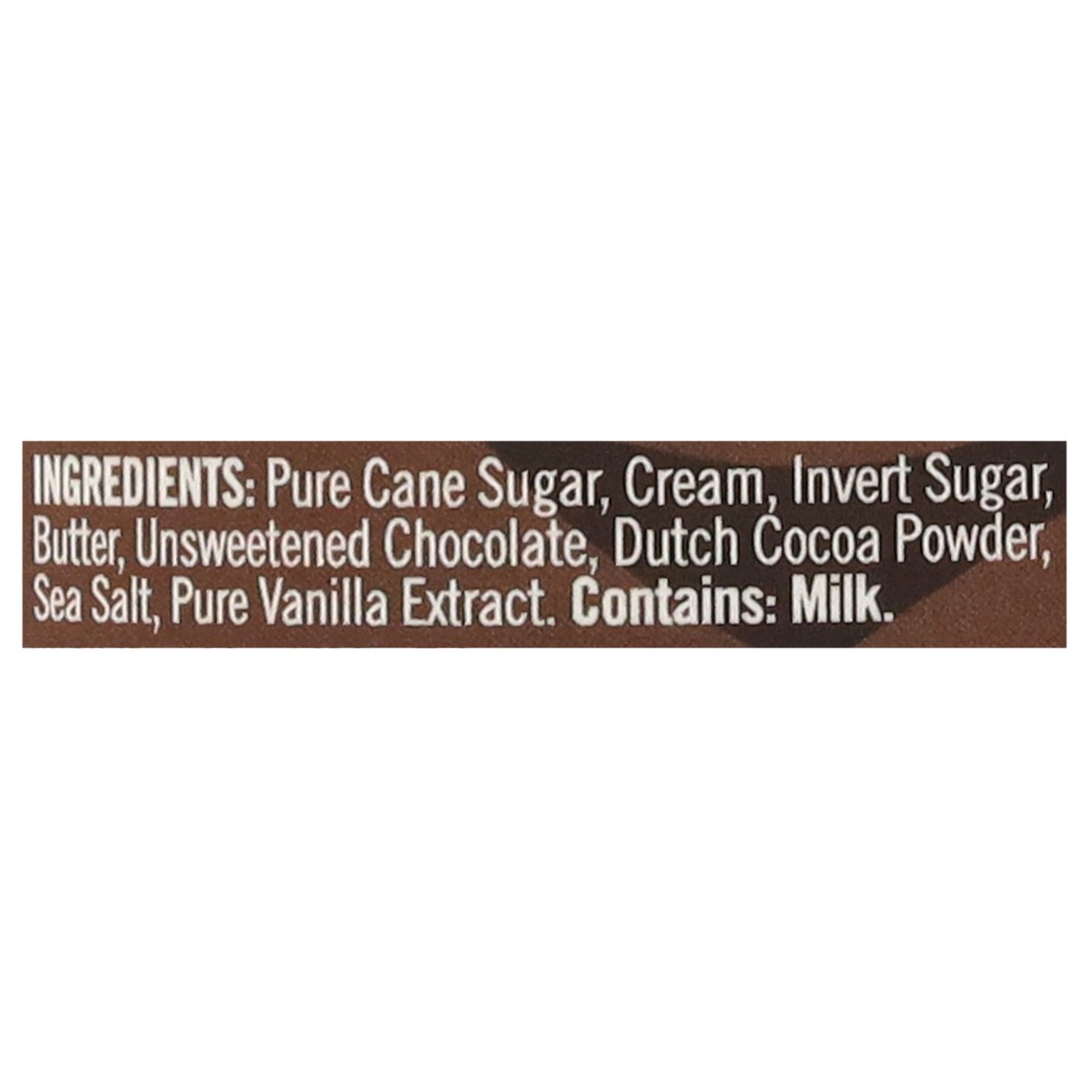 Pure Cane Sugar, Cream, Invert Sugar, Butter, Unsweetened Chocolate, Dutch Cocoa Powder, Sea Salt, Pure Vanilla Extract.