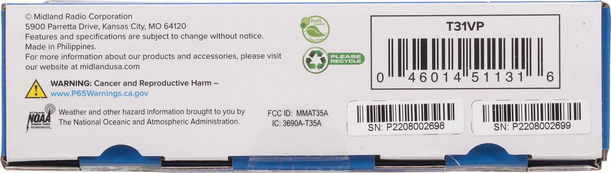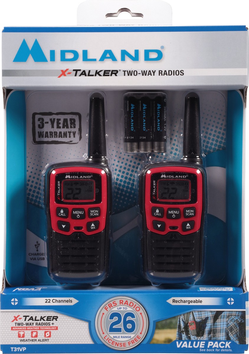 22 Channels. Advanced weather technology. Weather alert. FRS radio. Up to 26 mile range. License free. Rechargeable. See back for details. T31VP features: 22 Channels + 38 Privacy codes, call alert, c…