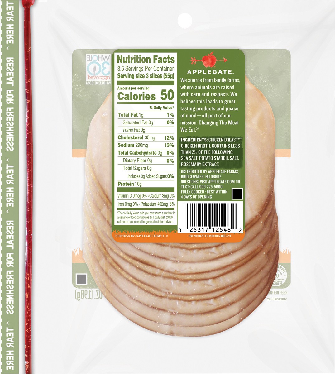Applegate Natural Oven Roasted Chicken Breast is fully cooked, sliced deli meat. It plays well with others. Add to your favorite salad, sandwich or wrap. It's the perfect lunch meat or cold cut. We so…