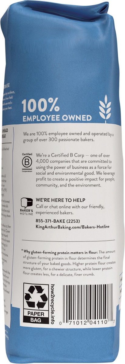 King Arthur Bread Flour is higher in protein than most.Ideal for yeast breads, pizza crust, rolls and more.Our flours contain no bleach, bromate, and no artificial preservatives of any kind. 100 perce…