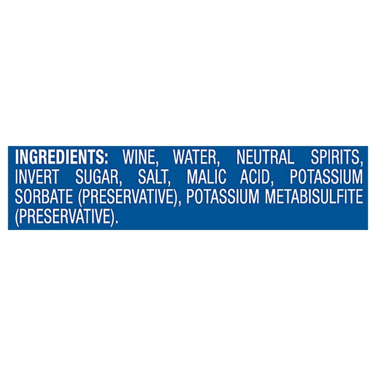 Wine, Water, Neutral Spirits, Invert Sugar, Salt, Malic Acid, Potassium Sorbate (Preservative), Potassium Metabisulfite (Preservative).
