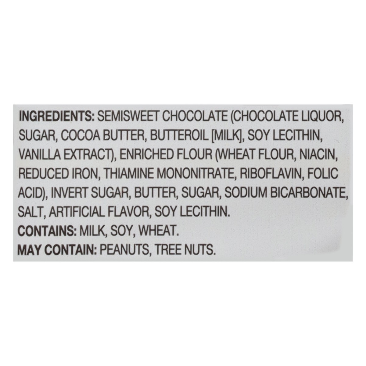 Semisweet Chocolate (Chocolate Liquor, Sugar, Cocoa Butter, Butteroil [Milk], Soy Lecithin, Vanilla Extract), Enriched Flour (Wheat Flour, Niacin, Reduced Iron, Thiamine Mononitrate, Riboflavin, Folic…