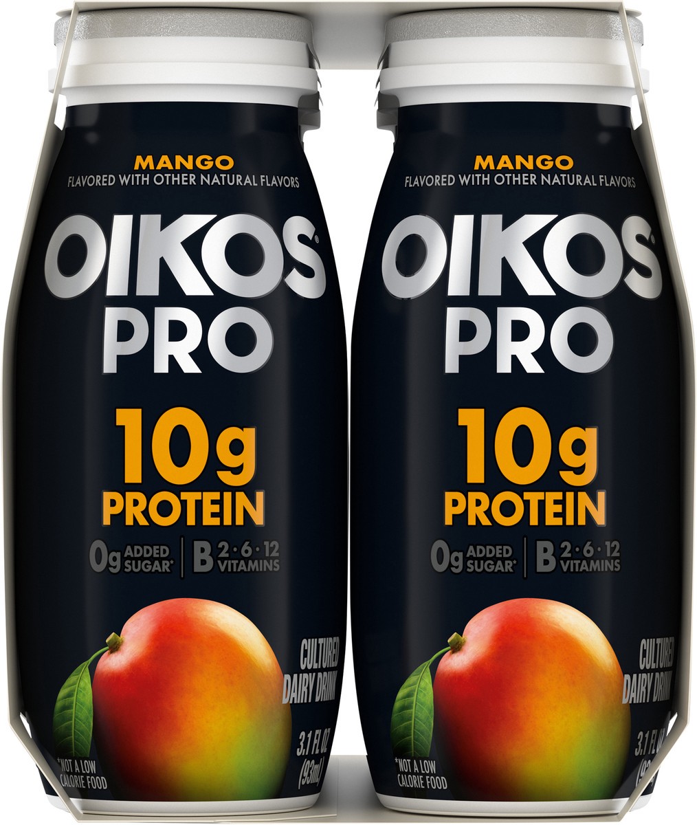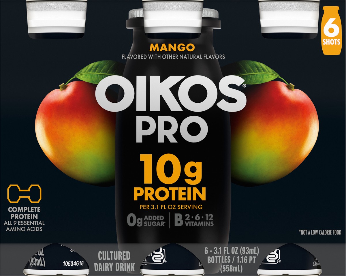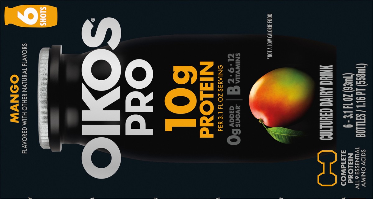 - Stronger Makes Everything Better: Six 3.1 fl oz bottles of Oikos Pro Shots Mango Cultured Dairy Drinks are a good source of B vitamins (B2, B6, B12)