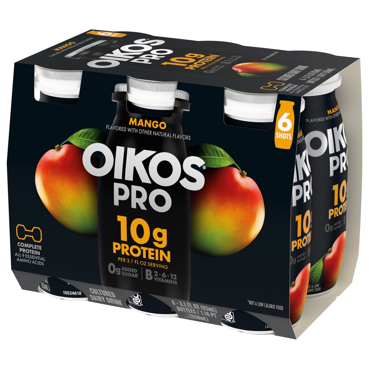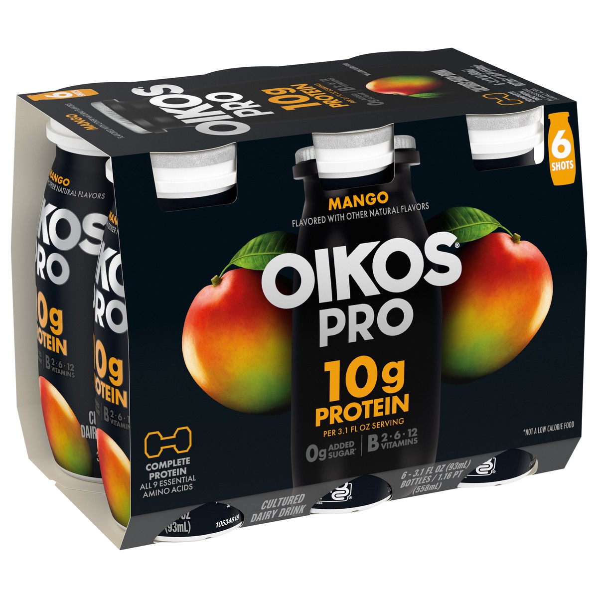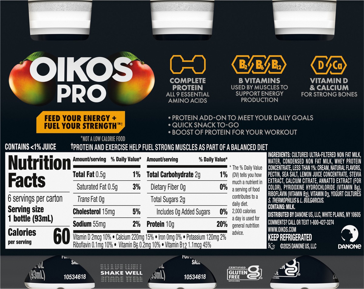 - Stronger Makes Everything Better: Six 3.1 fl oz bottles of Oikos Pro Shots Mango Cultured Dairy Drinks are a good source of B vitamins (B2, B6, B12)