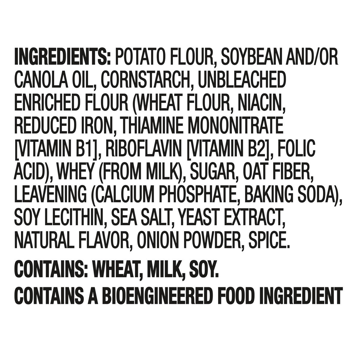 Potato Flour, Soybean and/or Canola Oil, Cornstarch, Unbleached Enriched Flour (Wheat Flour, Niacin, Reduced Iron, Thiamine Mononitrate [Vitamin B1], Riboflavin [Vitamin B2], Folic Acid), Whey (from M…