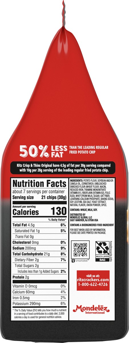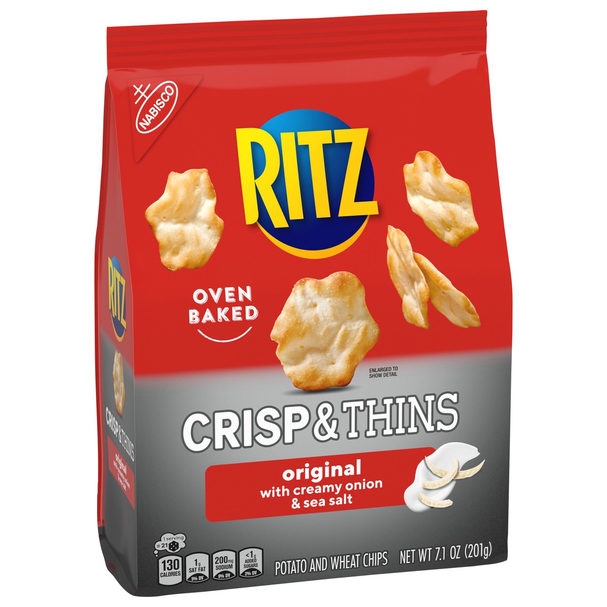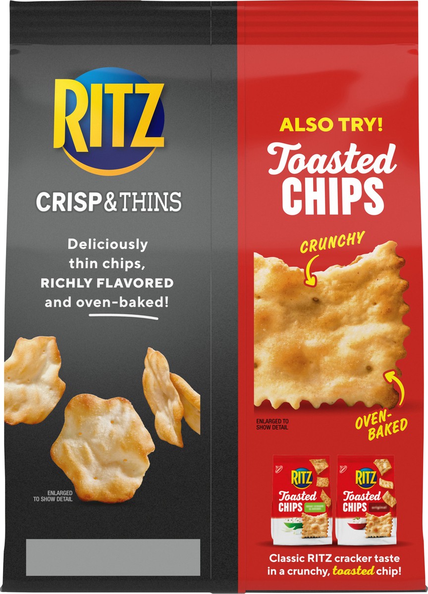 RITZ Crisp and Thins Original with Creamy Onion and Sea Salt are light chips that are oven baked, not fried, with a crispy, thin shape and an irresistible crunch. These potato and wheat chips contain …