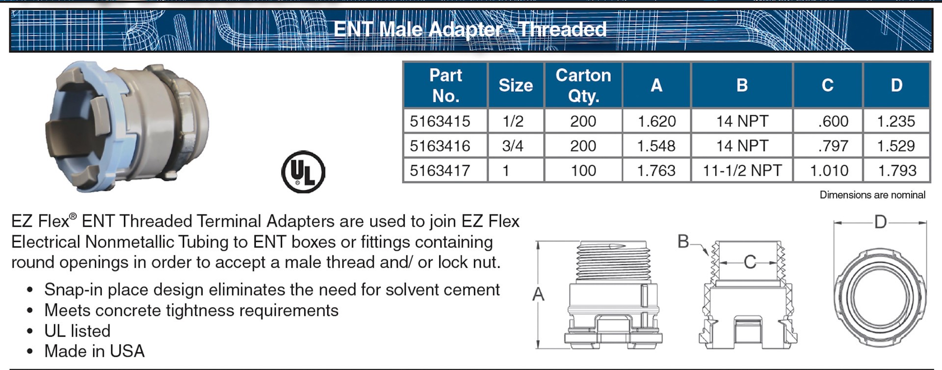 EZ Flex ENT Threaded Terminal Adapter used to join EZ Flex Electrical Nonmetallic Tubing to ENT box or fitting containing a round opening to accept a male thread and lock nut. Snap-in place design eliā¦