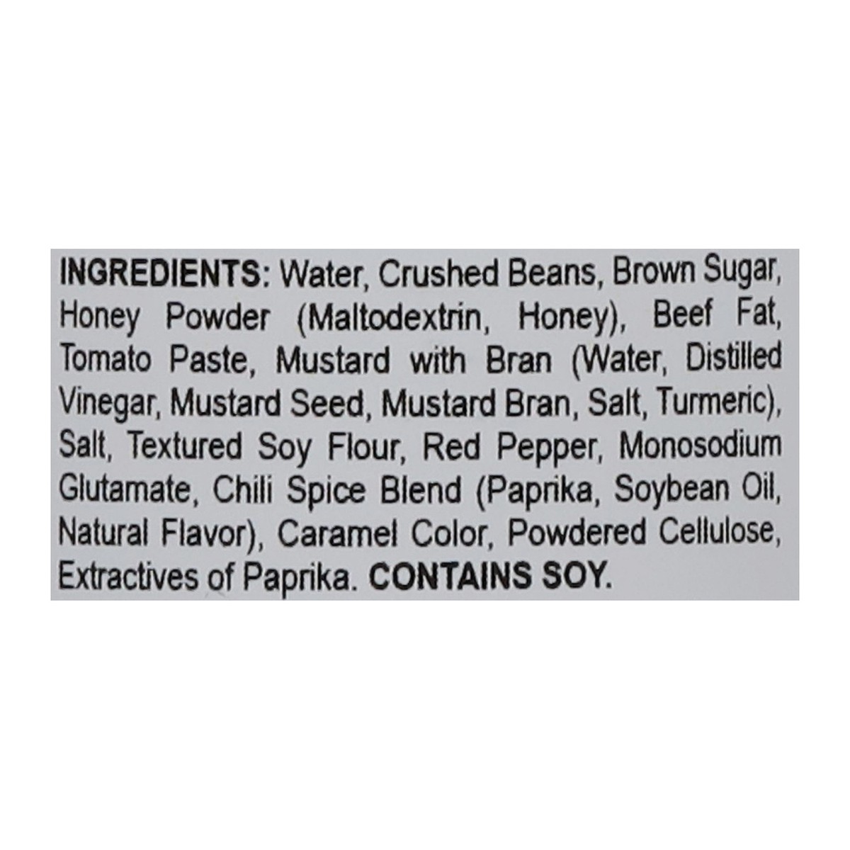 Water, Crushed Beans, Brown Sugar, Honey Powder (Maltodextrin, Honey), Beef Fat, Tomato Paste, Mustard with Bran (Water, Distilled Vinegar, Mustard Seed, Mustard Bran, Salt, Turmeric), Salt, Textured …