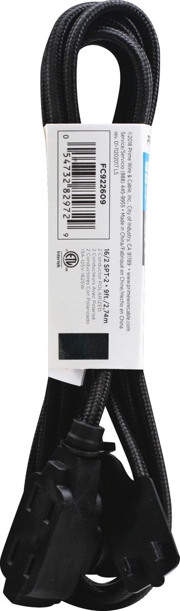 Polarized. 2-prong plug. 16/2 Spt-2. 9 ft/2,74 m. 2 conductor polarized. 3 outlets. Low profile plug. Flame retardant. www.primcewirecable.com. Service 888-445-9955. ETL listed - Intertek. Made in Chi…
