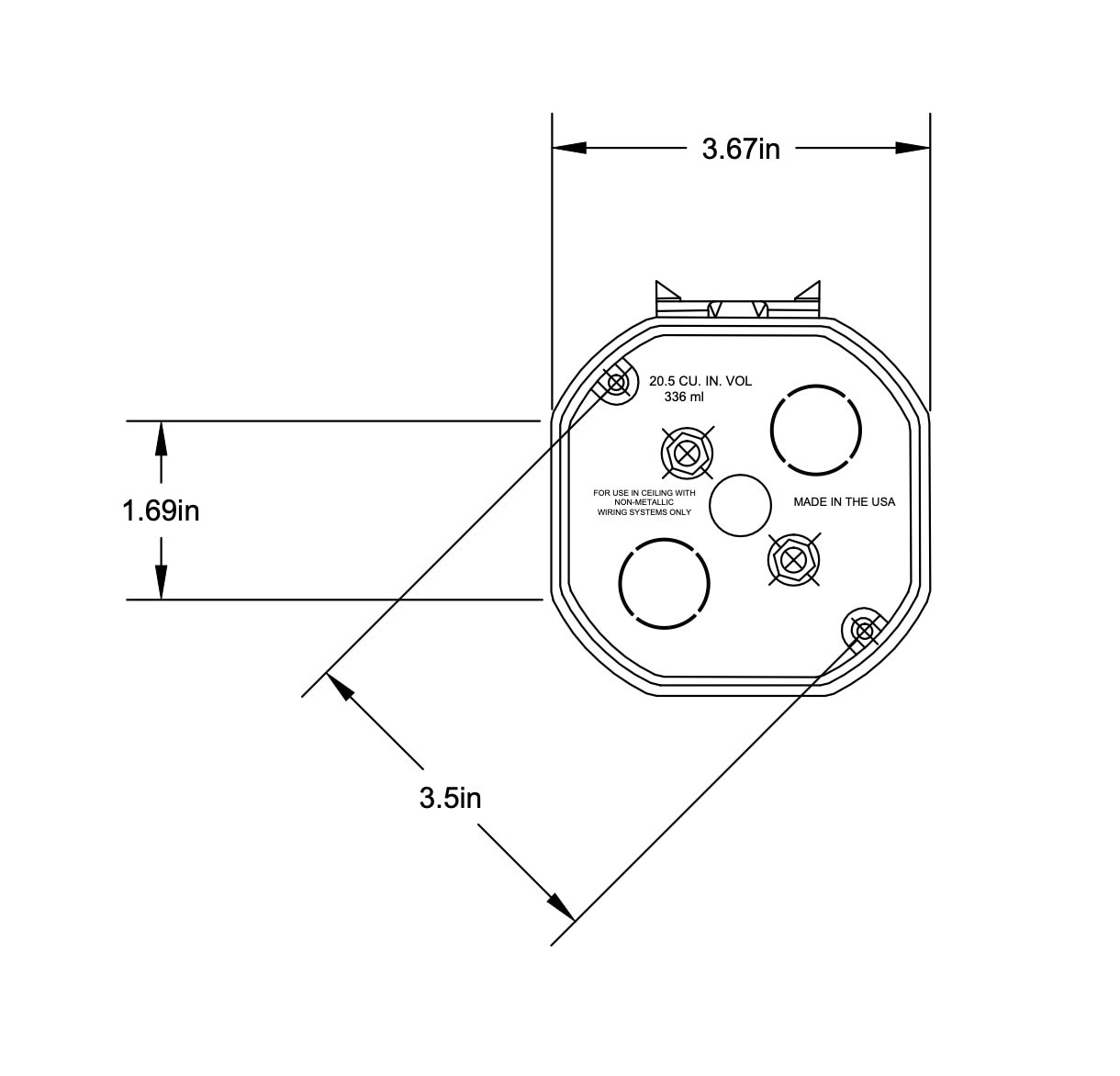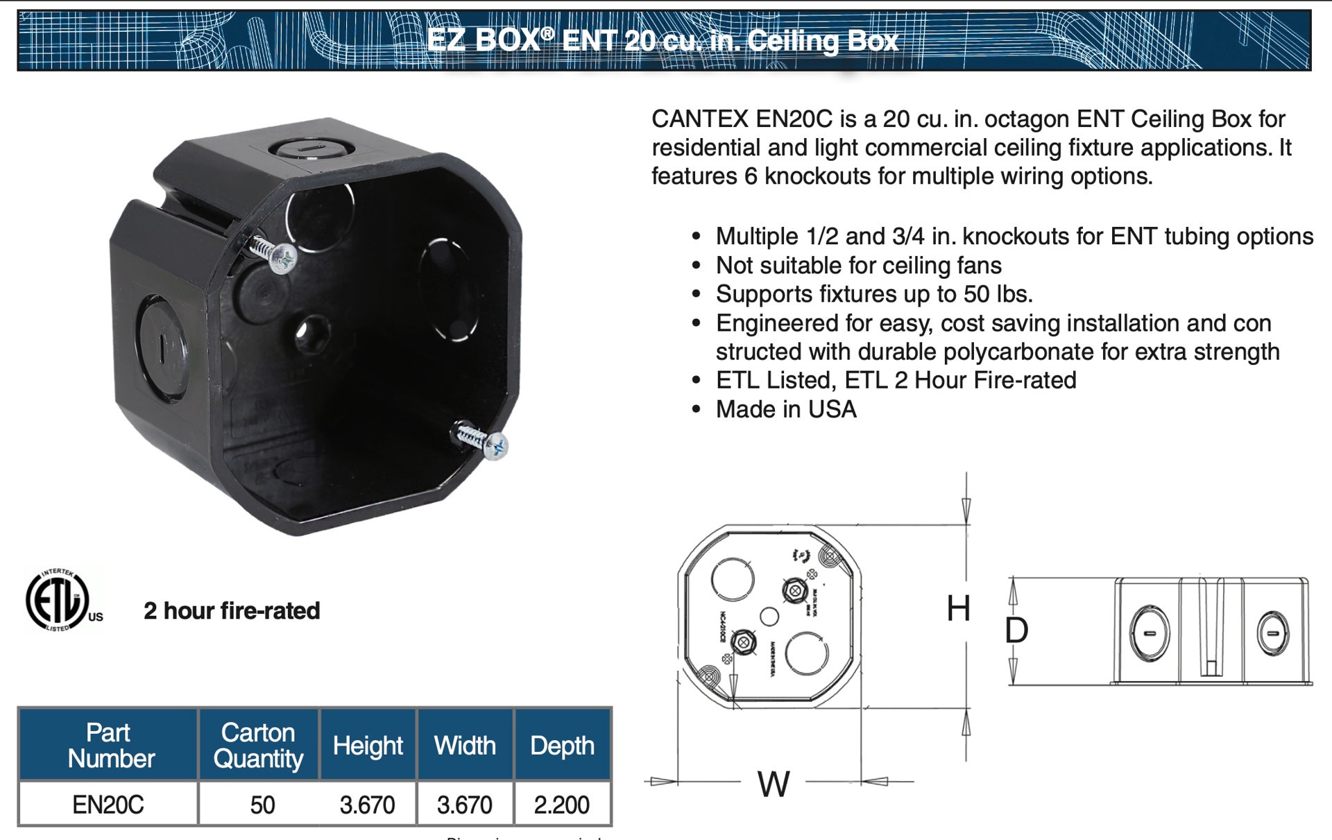 Multiple 1/2 and 3/4 in knockouts for ENT tubing options. Not suitable for ceiling fans. Made in USA.