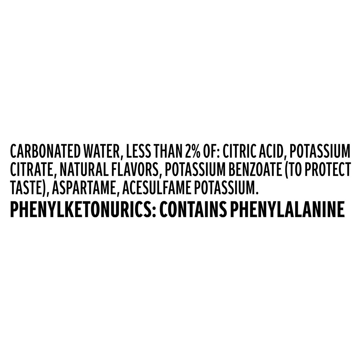 Carbonated Water, Less than 2% of: Citric Acid, Potassium Citrate, Natural Flavors, Potassium Benzoate (to Protect Taste), Aspartame, Acesulfame Potassium.