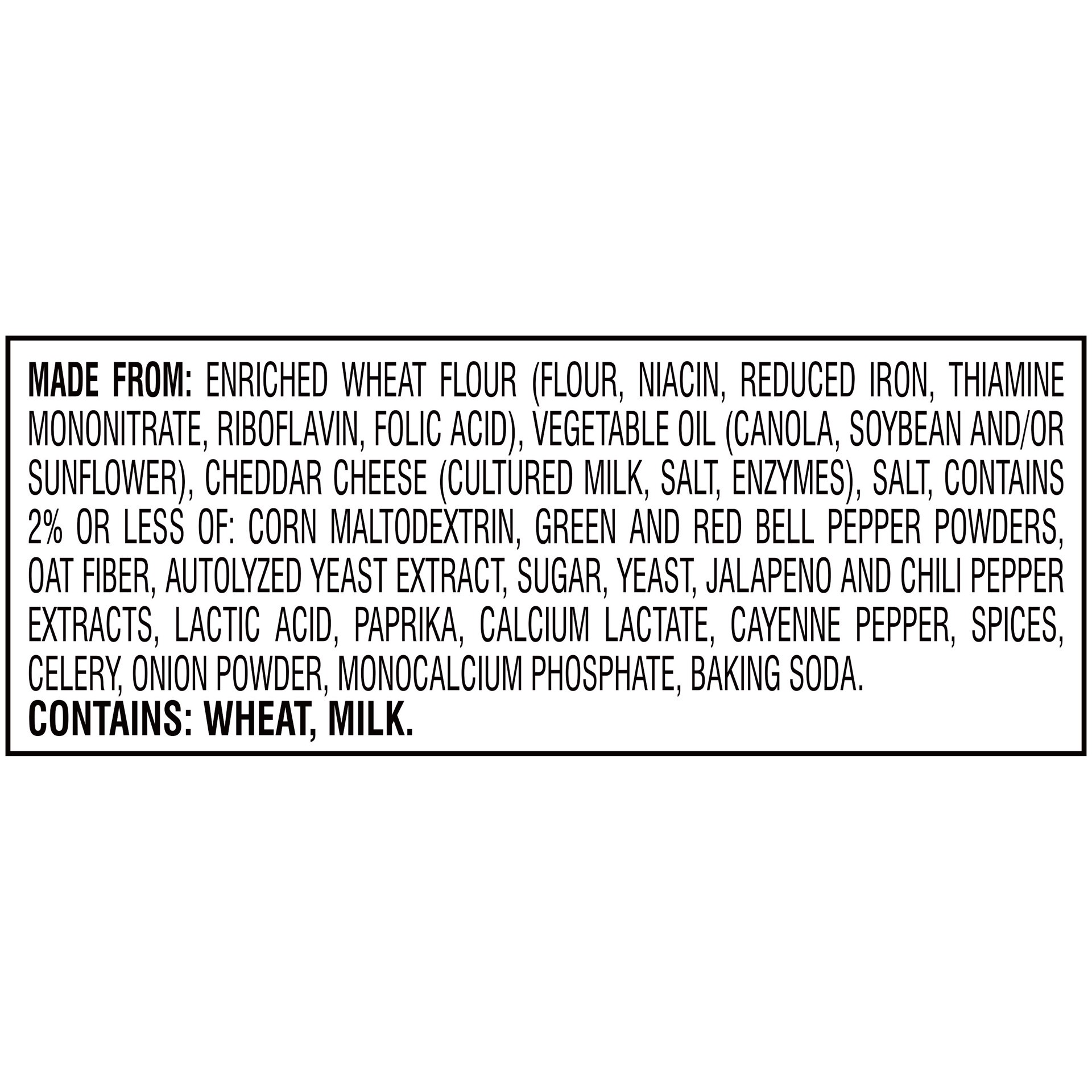 MADE FROM: ENRICHED WHEAT FLOUR (FLOUR, NIACIN, REDUCED IRON, THIAMINE MONONITRATE, RIBOFLAVIN, FOLIC ACID), VEGETABLE OIL (CANOLA, SOYBEAN AND/OR SUNFLOWER), CHEDDAR CHEESE (CULTURED MILK, SALT, ENZY…