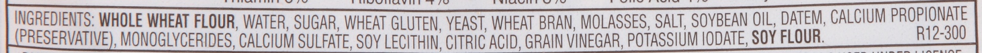 WHOLE WHEAT FLOUR, WATER, SUGAR, WHEAT GLUTEN, YEAST, WHEAT BRAN, MOLASSES, SALT, SOYBEAN OIL, DATEM, CALCIUM PROPIONATE (PRESERVATIVE), MONOGLYCERIDES, CALCIUM SULFATE, SOY LECITHIN, CITRIC ACID, GRA…