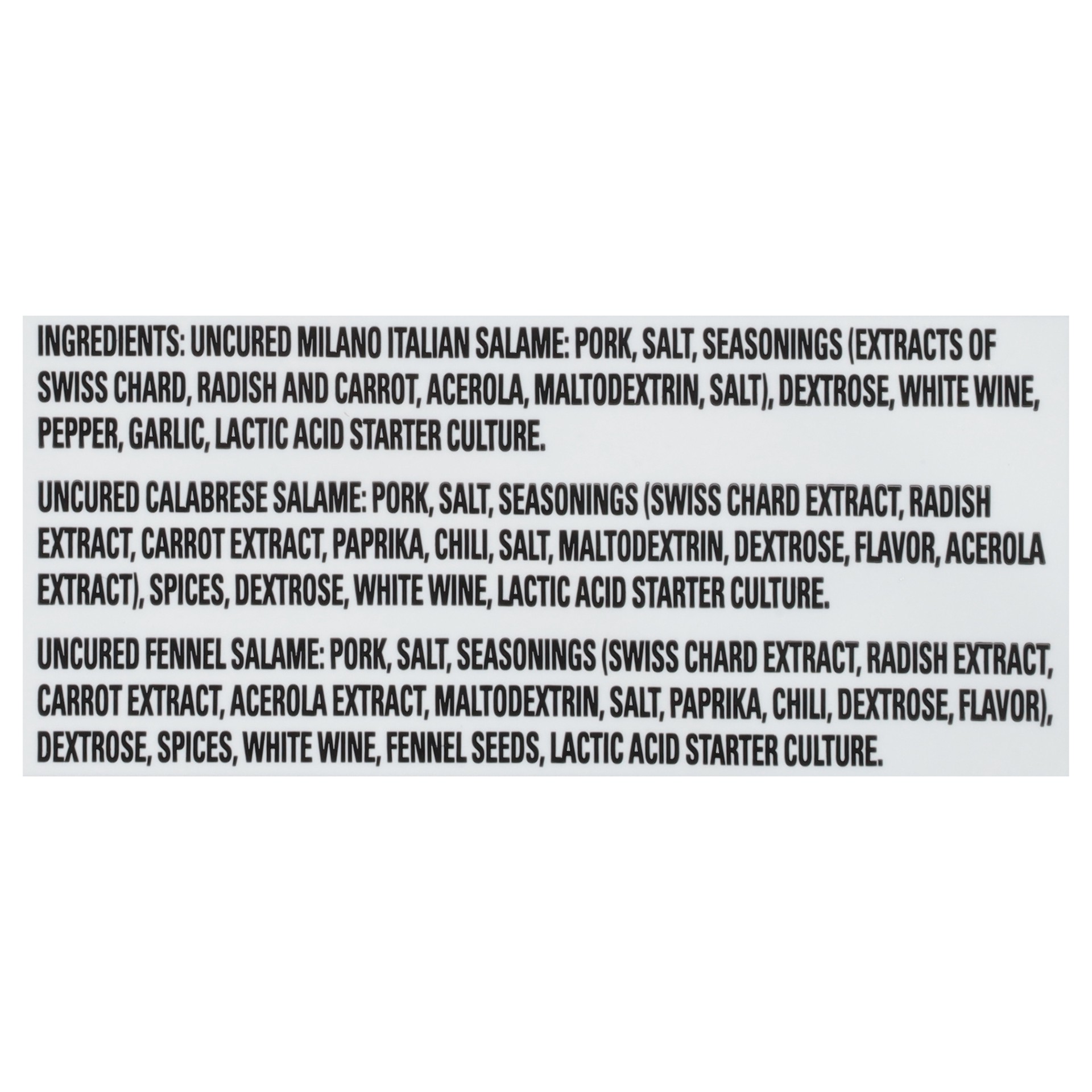 Uncured Milano Italian Salame: Pork, Salt, Seasonings (Extracts of Swiss Chard, Radish and Carrot, Acerola, Maltodextrin, Salt), Dextrose, White Wine, Pepper, Garlic, Lactic Acid Starter Culture. Uncu…