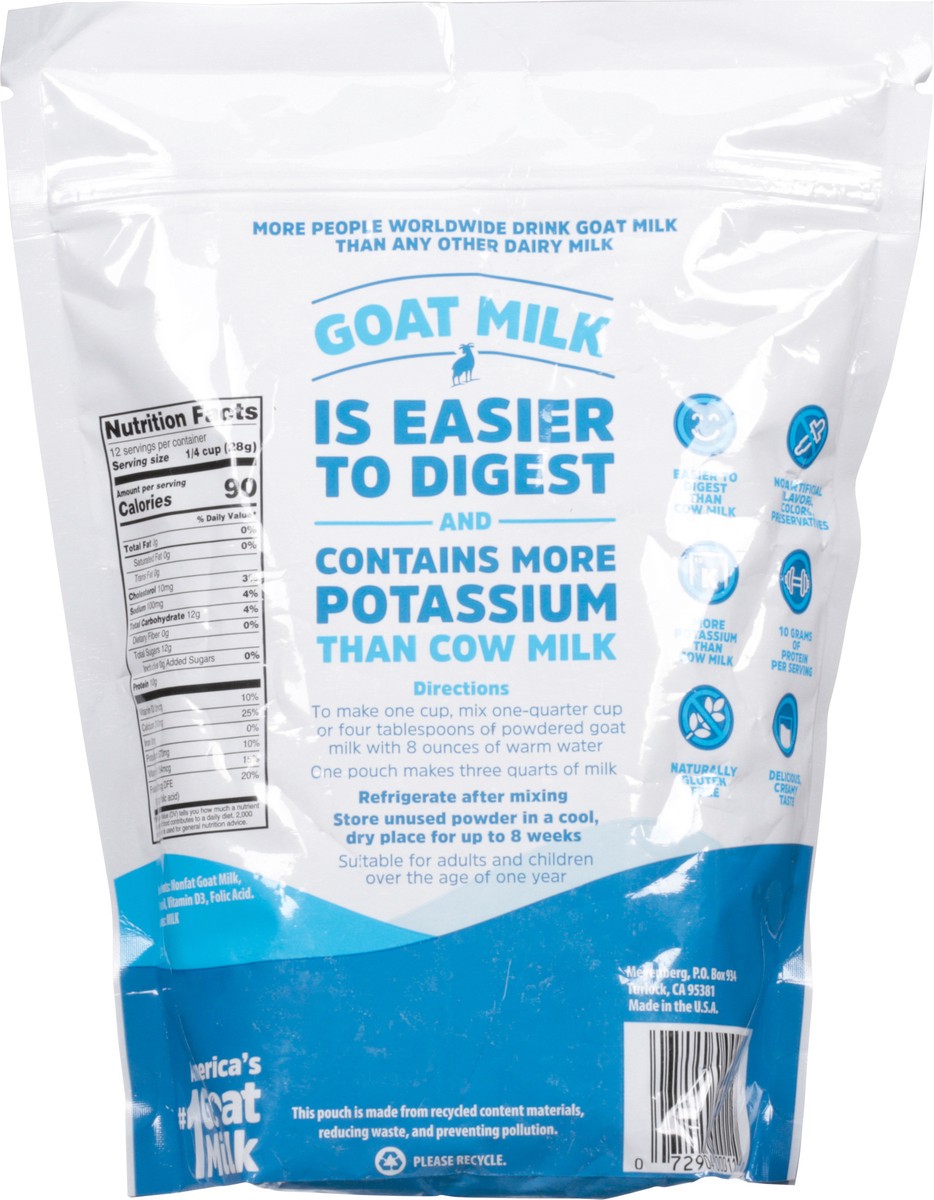 Makes 3 quarts. Easy to digest. Pasteurized. Since 1934. America's No. 1 goat milk. More people worldwide drink goat milk than any other dairy milk. Goat milk is easier to digest and contains more pot…