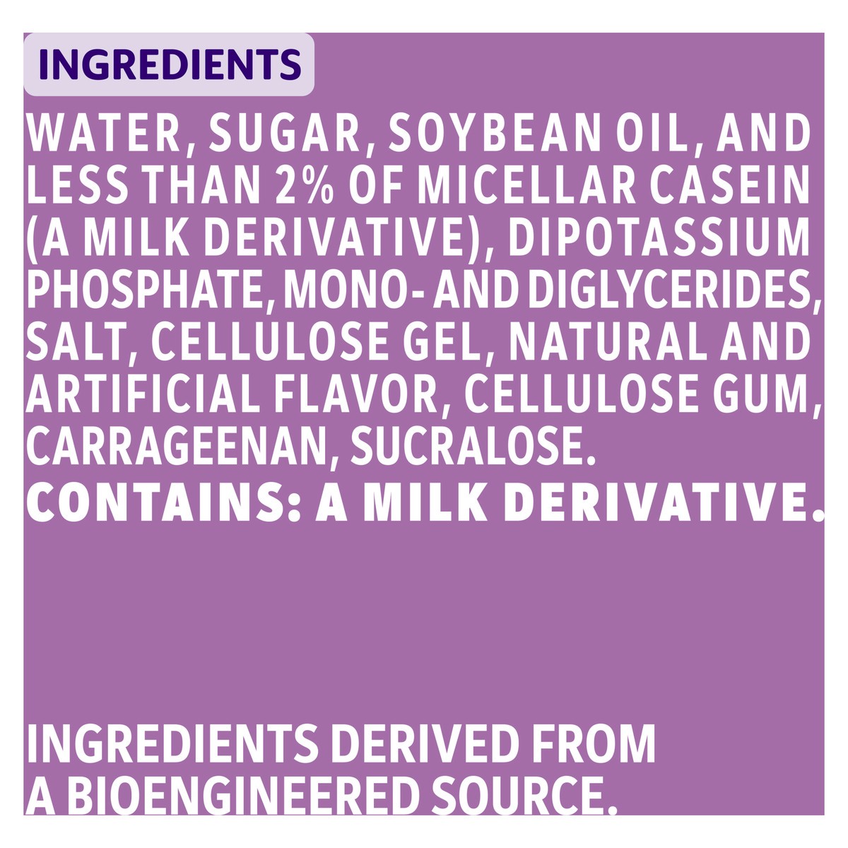 WATER, SUGAR, SOYBEAN OIL, AND LESS THAN 2% OF MICELLAR CASEIN (A MILK DERIVATIVE), DIPOTASSIUM PHOSPHATE, MONO- AND DIGLYCERIDES, SALT, CELLULOSE GEL, NATURAL AND ARTIFICIAL FLAVOR, CELLULOSE GUM, CA…