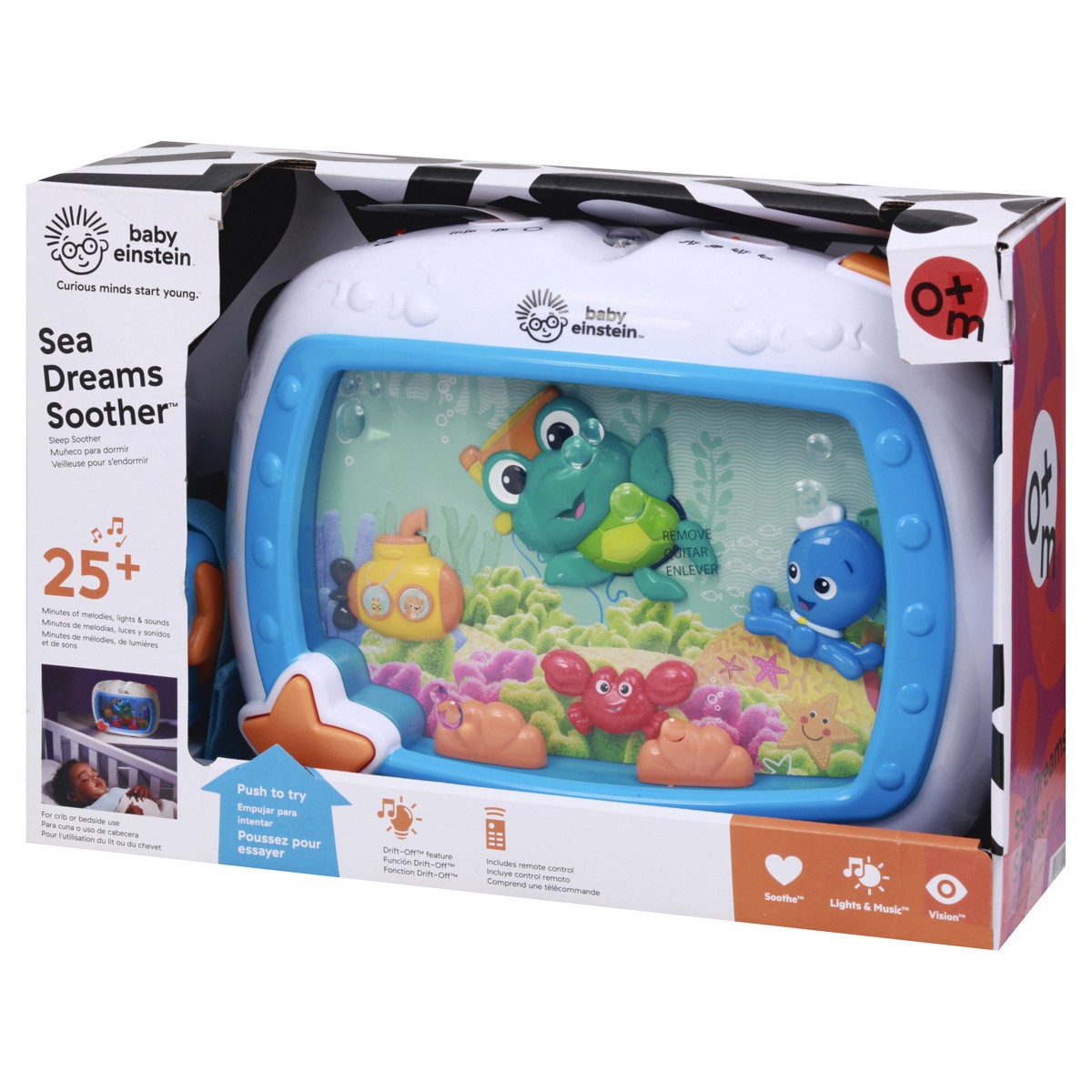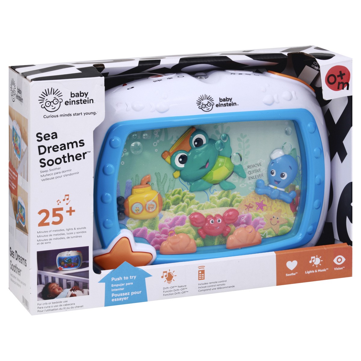 0+m. Curious minds start young. 25+ minutes of melodies, lights & sounds. For crib or bedside use. Drift-off feature. Includes remote control. Soothe. Lights & music. Vision. Lights and sound soften g…