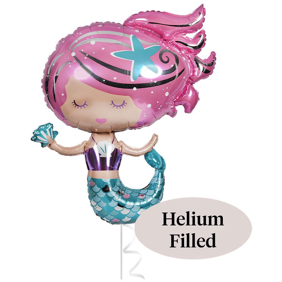 Dazzle the birthday guests with the Shimmering Mermaid Balloon This foil balloon looks just like a magical mermaid with pink hair and an aquamarine fish tail. The mermaid comes in peace and she has a …
