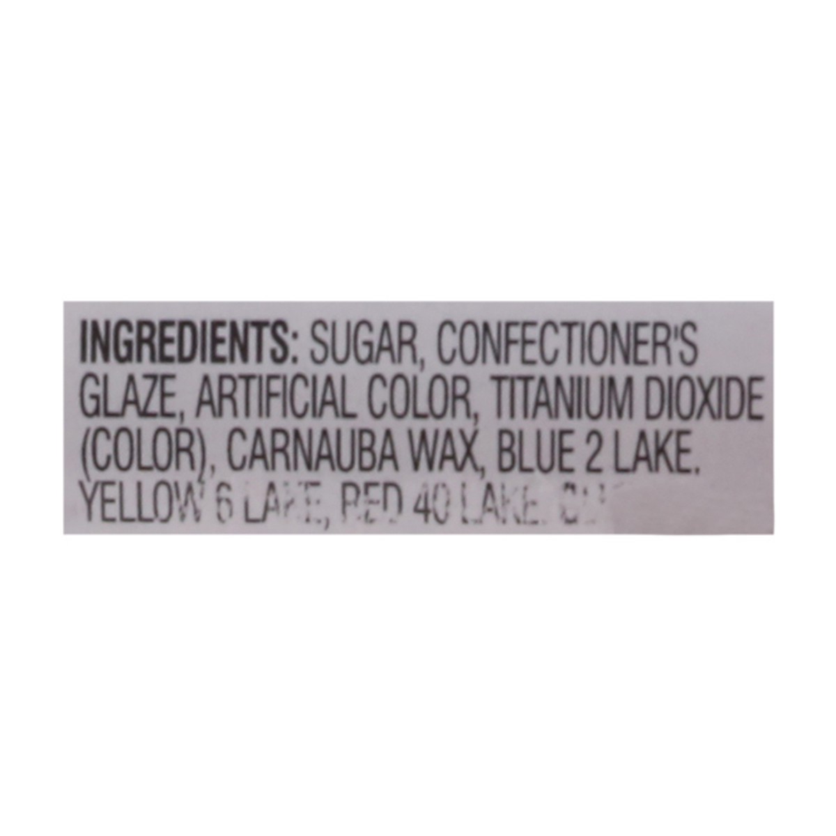 Sugar, Confectioner''s Glaze, Artificial Color, Titanium Dioxide (Color), Carnauba Wax, Blue 2 Lake, Yellow 6 Lake, Red 40 Lake.