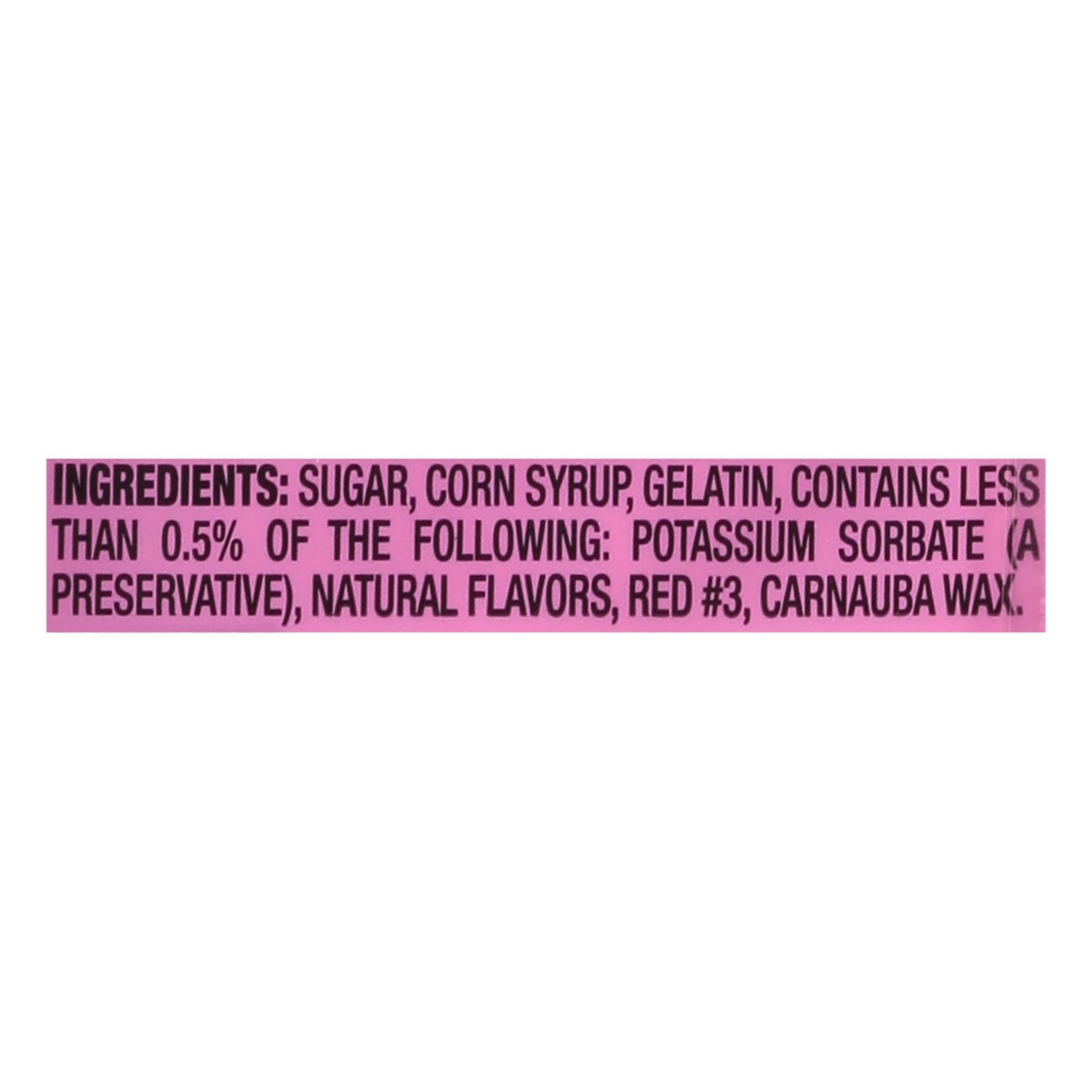 Sugar, Corn Syrup, Gelatin, contains less than 0.5% of the Following Ingredients: Potassium Sorbate (a Preservative), Natural Flavors, Red #3, Carnauba Wax.