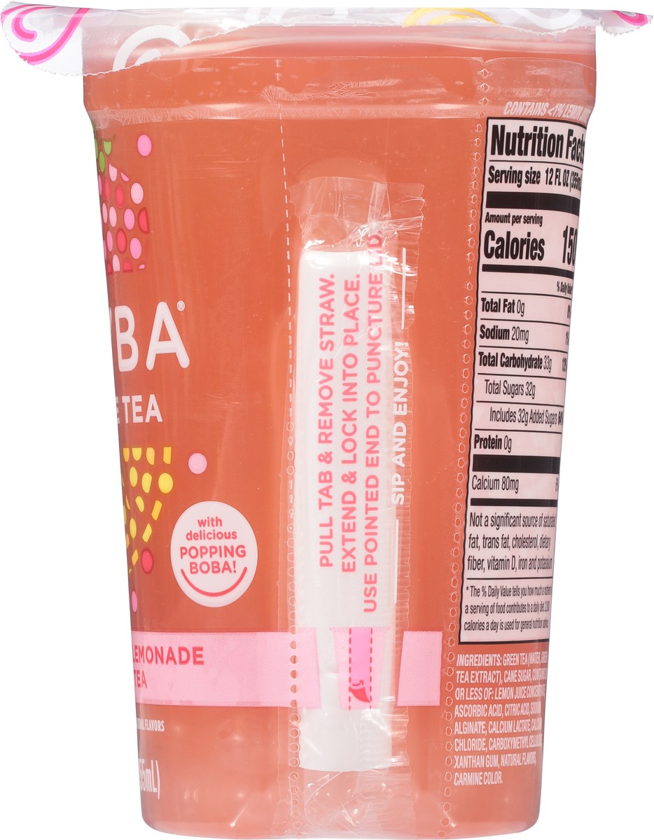 Brewed Green Tea (Water, Green Tea Concentrate), Boba Bubbles (Water, Cane Sugar, Calcium Lactate, Citric Acid, Sodium Alginate, Xanthan Gum, Calcium Chloride, Carboxymethyl Cellulose), Cane Sugar, Na…