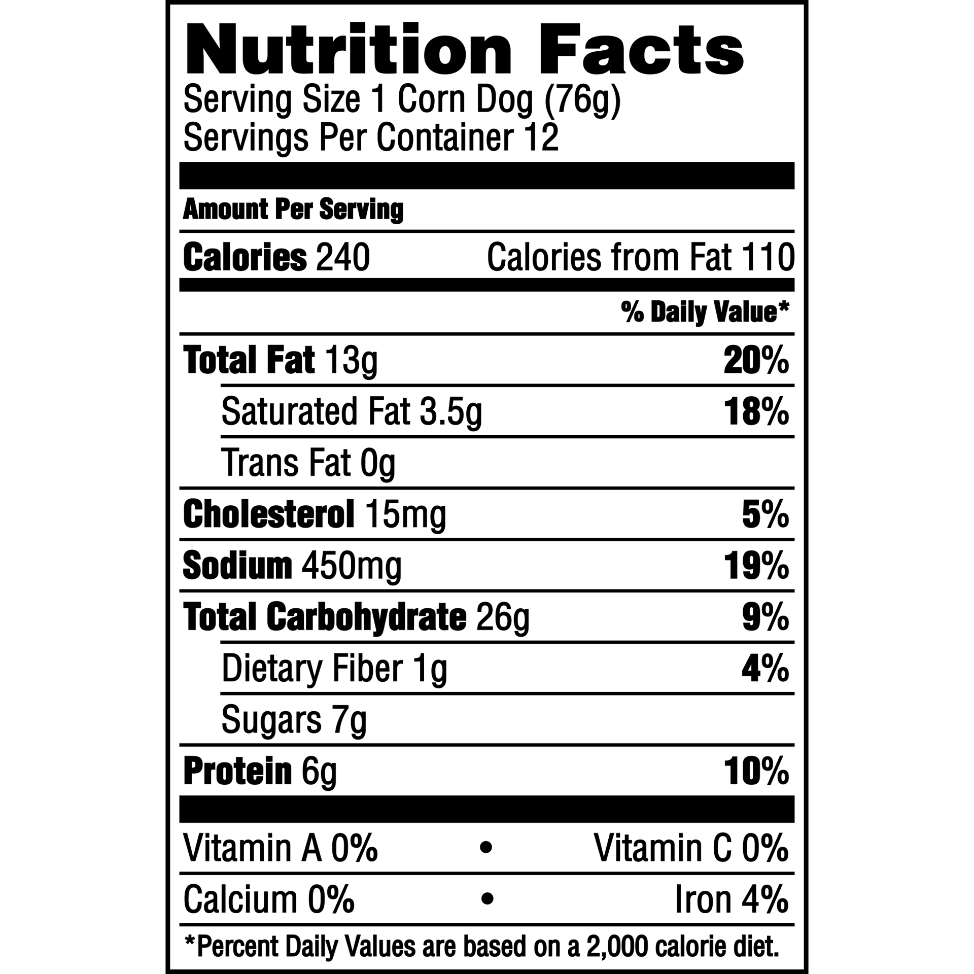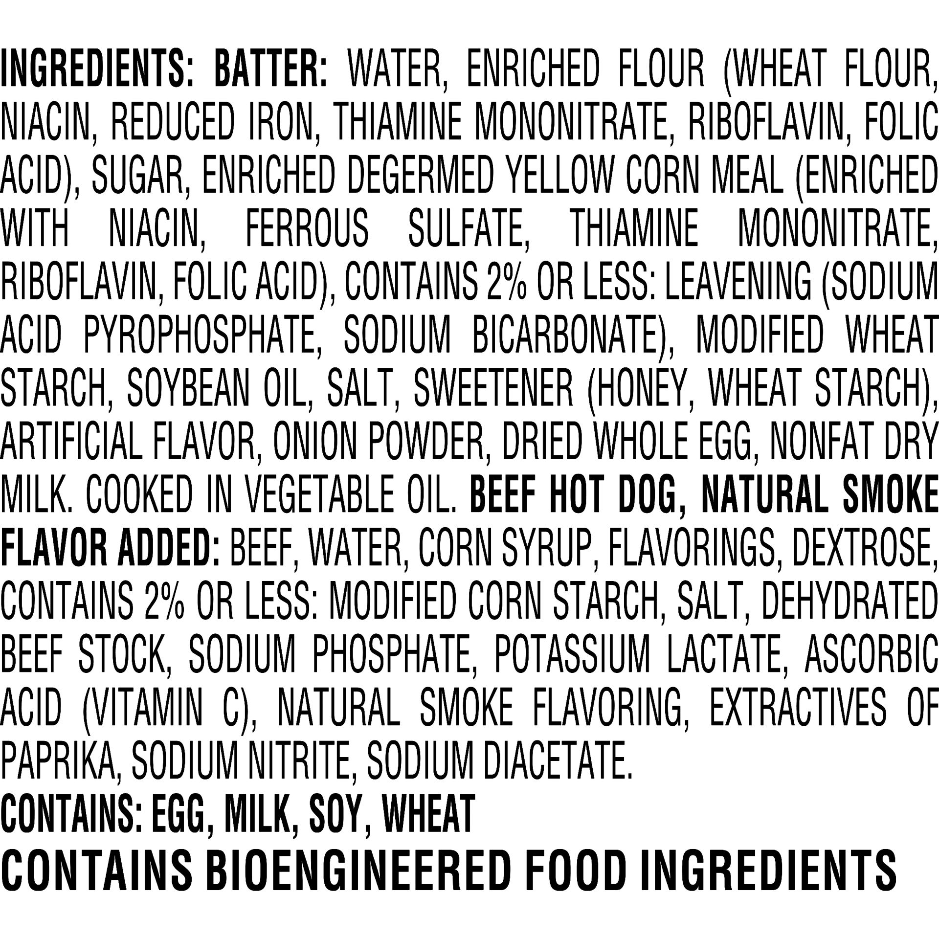 BATTER: Water, enriched flour (wheat flour, niacin, reduced iron, thiamine mononitrate, riboflavin, folic acid), sugar, enriched degermed yellow corn meal (enriched with niacin, ferrous sulfate, thiam…