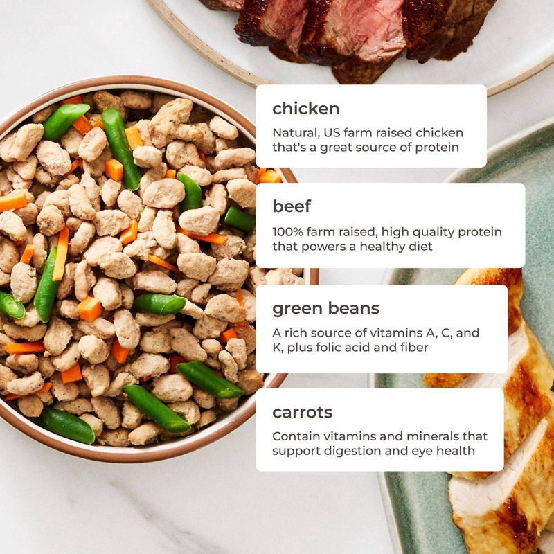 Gently steamed with fresh all-natural chicken and beef, eggs, vitamin-rich green beans & carrots, this recipe comes in a convenient resealable bag. This meal includes EPA & DHA from fish oil to suppor…