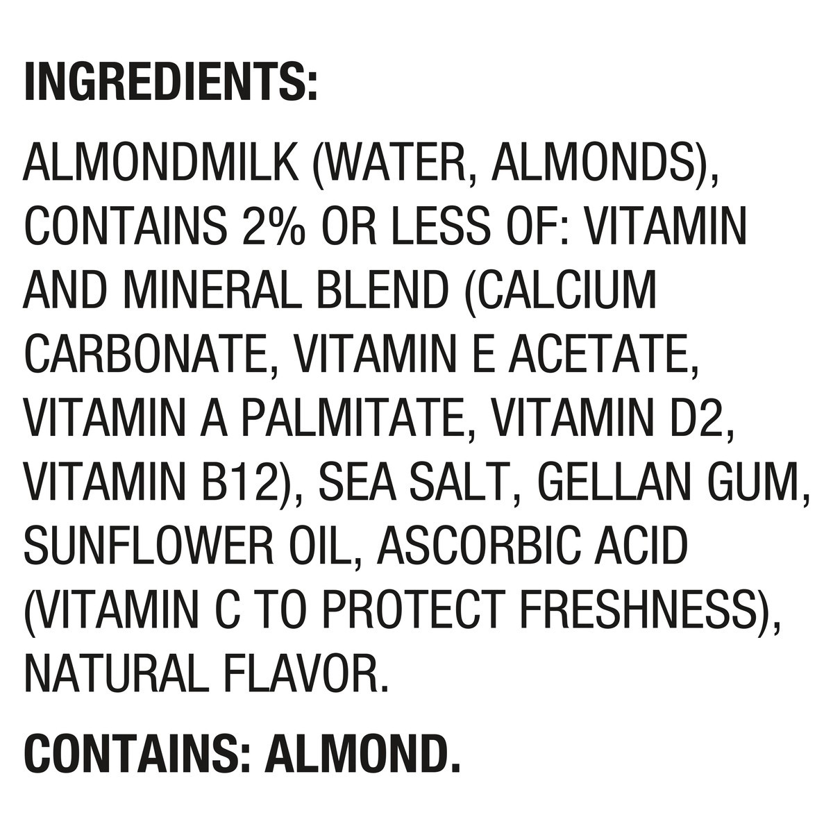 ALMONDMILK (WATER, ALMONDS), CONTAINS 2% OR LESS OF: VITAMIN AND MINERAL BLEND (CALCIUM CARBONATE, VITAMIN E ACETATE, VITAMIN A PALMITATE, VITAMIN D2, VITAMIN B12), SEA SALT, GELLAN GUM, SUNFLOWER OIL…