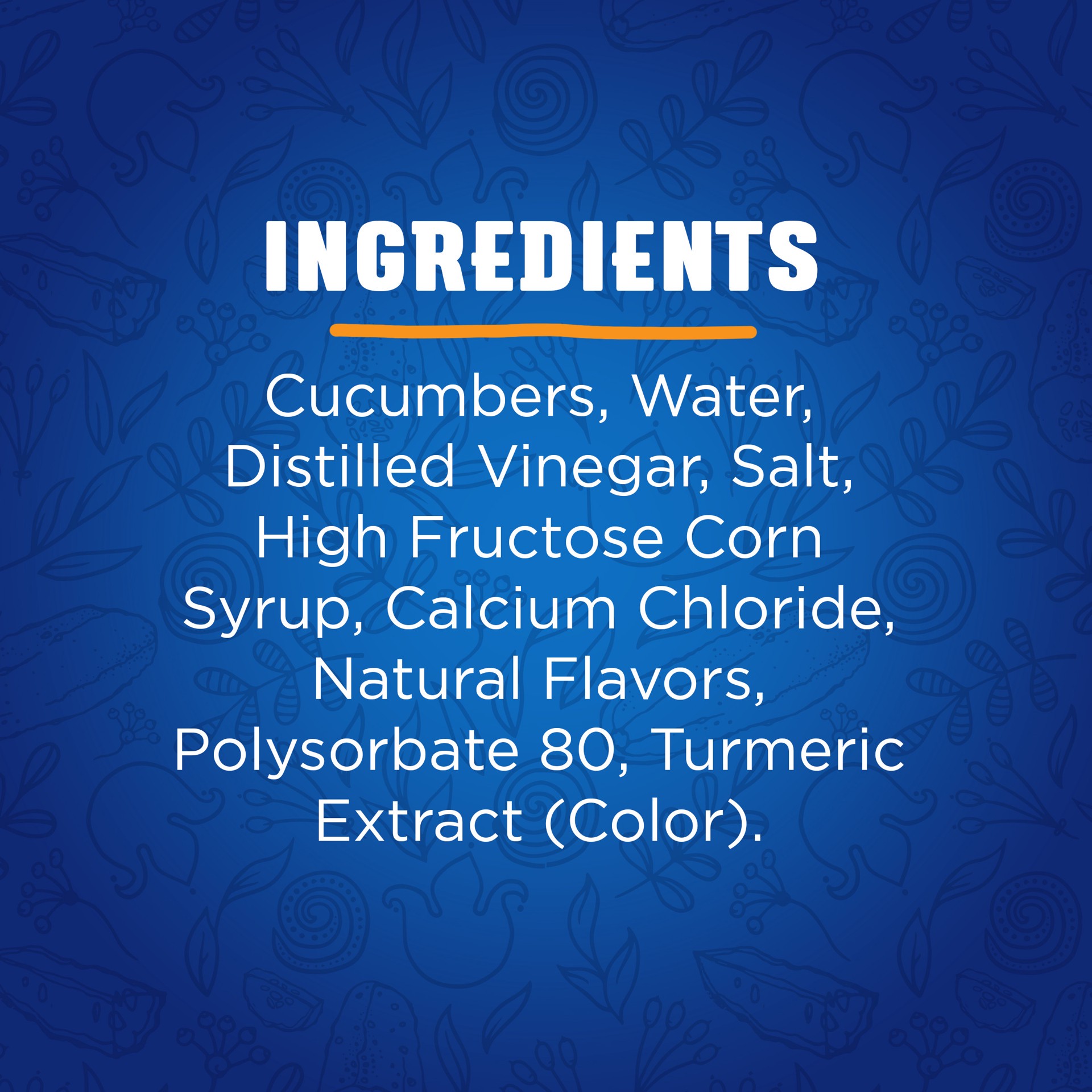 Cucumbers, Water, High Fructose Corn Syrup, Distilled Vinegar, Salt, Calcium Chloride, Natural Flavor, Polysorbate 80, Sucralose, Turmeric Extract (Color).