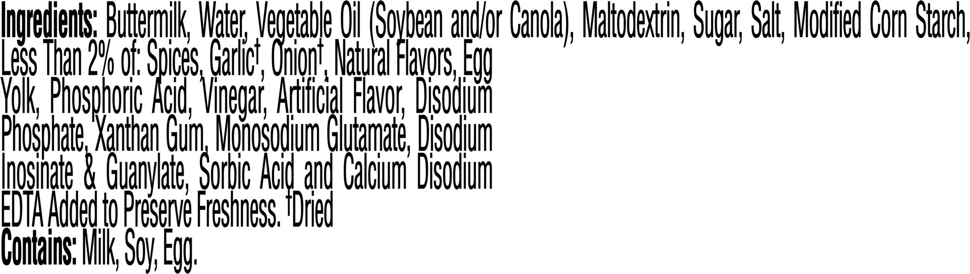 Buttermilk, Water, Vegetable Oil (Soybean and/or Canola), Maltodextrin, Sugar, Salt, Modified Corn Starch, Less Than 2% of: Spices, Garlic (3), Onion (3), Natural Flavors, Egg Yolk, Phosphoric Acid, V…