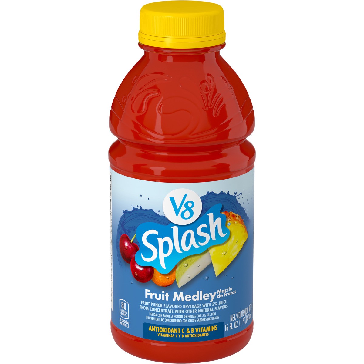 Quench your thirst with the refreshing taste of V8 Splash Fruit Medley Flavored Juice Beverage. This 5% juice blend is made from the concentrated juices of carrots, pears, apples, pineapple and cherri…
