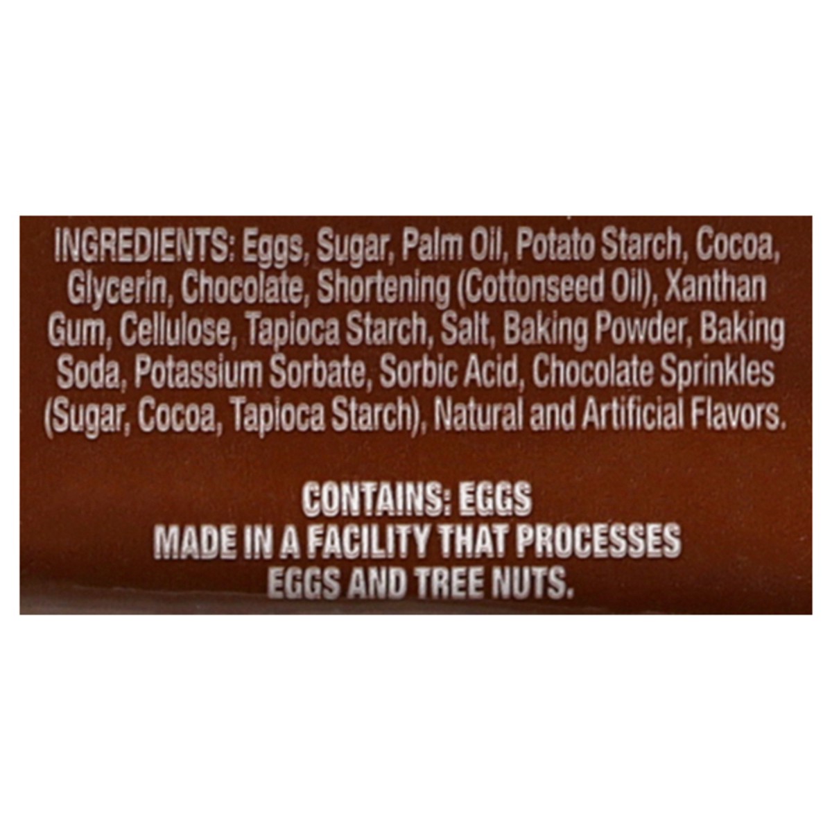 Eggs, Sugar, Palm Oil, Potato Starch, Cocoa, Glycerin, Chocolate, Shortening (Cottonseed Oil), Xanthan Gum, Cellulose, Tapioca Starch, Salt, Baking Powder, Baking Soda, Potassium Sorbate, Sorbic Acid,…