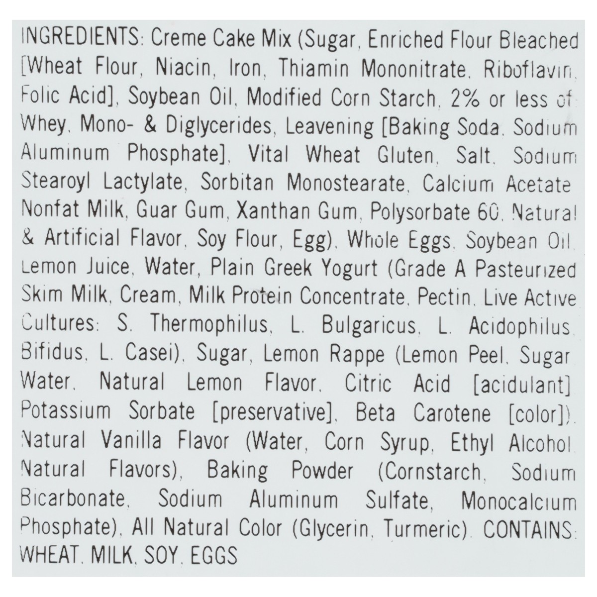 Creme Cake Mix (Sugar, Enriched Flour Bleached [Wheat Flour, Niacin, Iron, Thiamin Mononitrate, Riboflavin, Folic Acid], Soybean Oil, Modified Corn Starch, 2% or Less of Whey, Mono- & Diglycerides, Le…