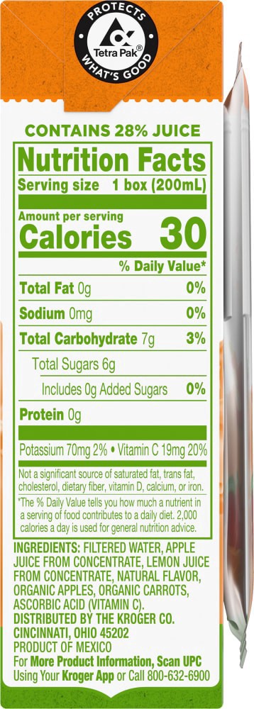 Simple Truth® Apple Carrot Kids Juice Boxes are a delightful blend of real apples and carrots. Each juice box has 30 calories per serving and has no sugar addedˆ. Non-GMO and high in vitamin C, this i…