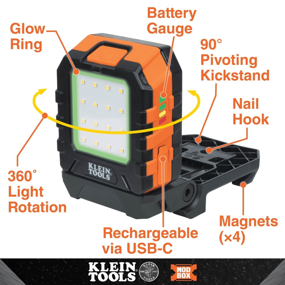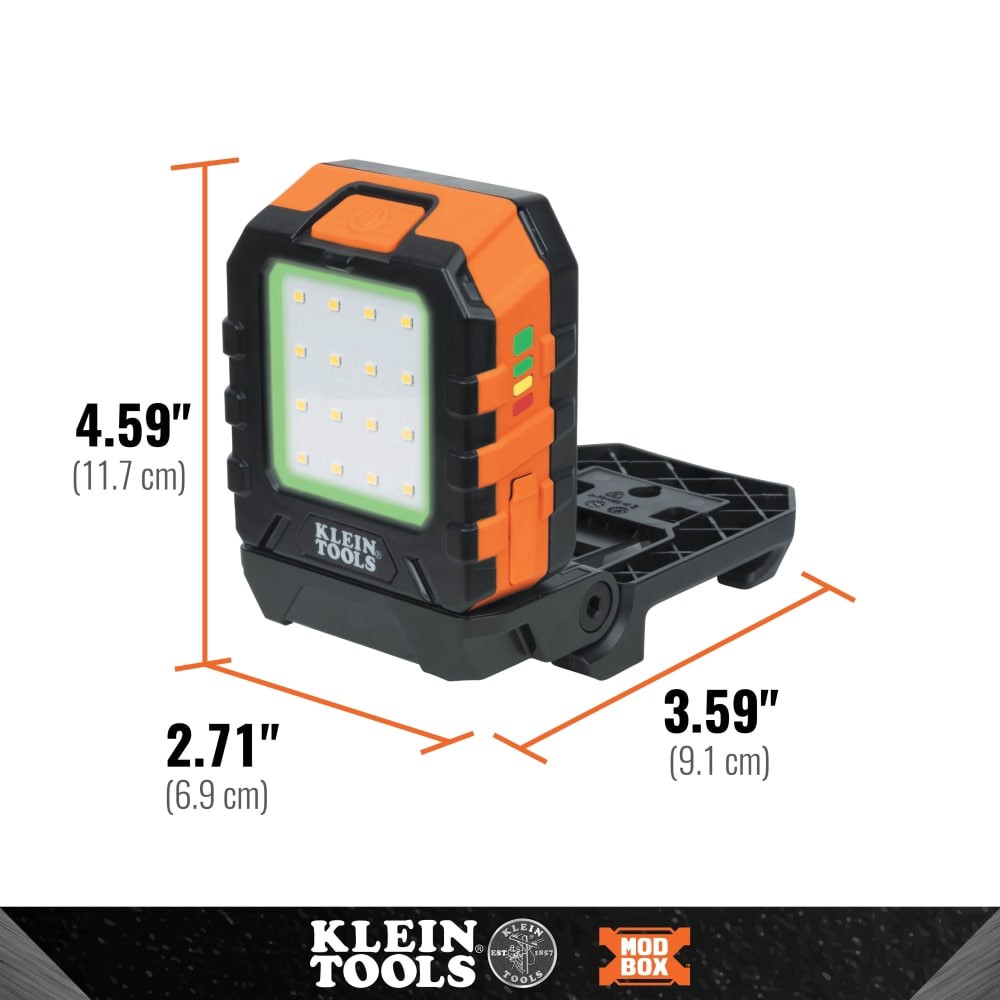 The MODbox™ Area Light is a portable jobsite work light solution with angle versatility and optimal hands-free use. LED Light modes are High: 1000 Lumens for 9 hours; Medium: 425 Lumens for 14 hours; …