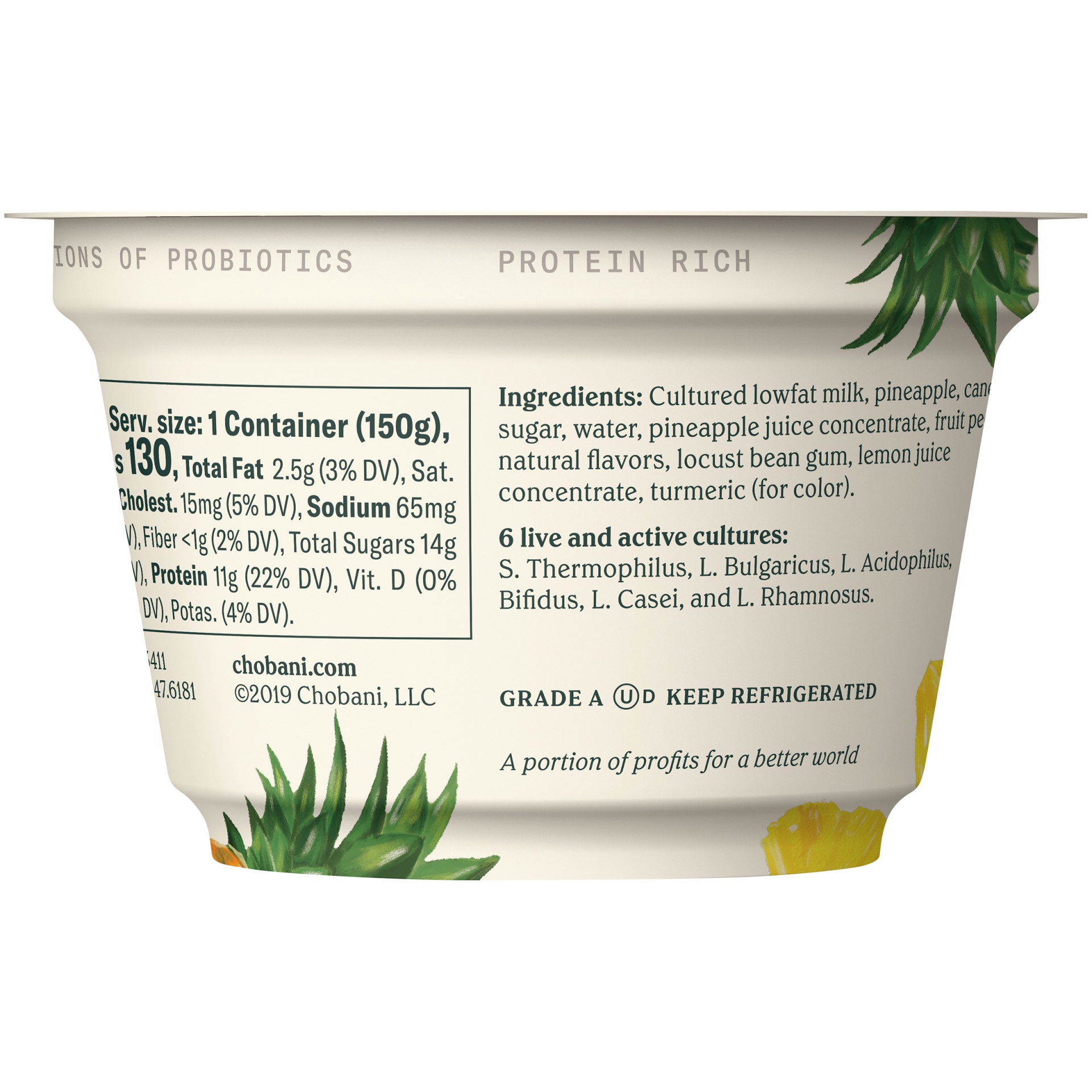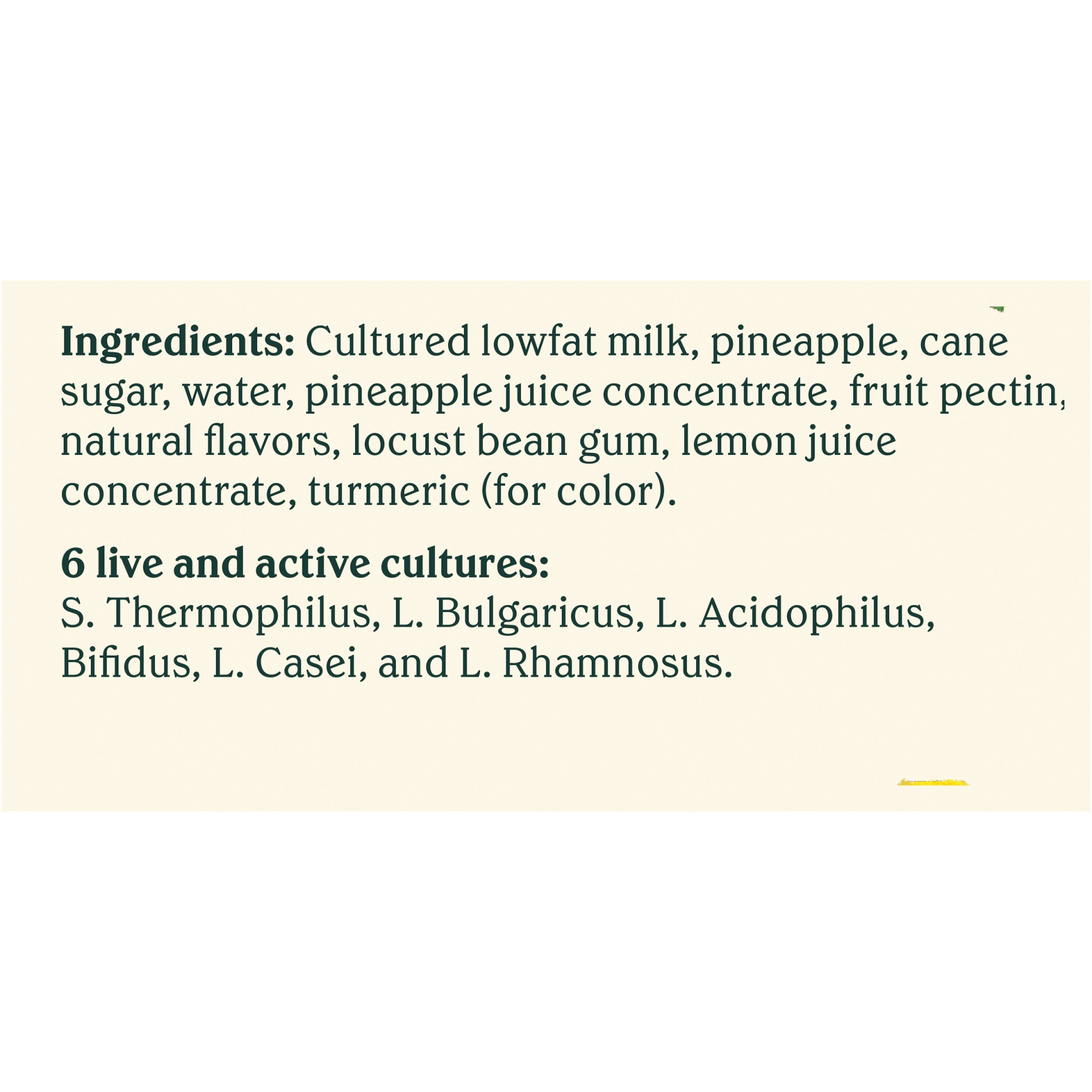 Cultured Lowfat Milk, Pineapple, Cane Sugar, Water, Fruit Pectin, Pineapple Juice Concentrate, Natural Flavors, Guar Gum, Locust Bean Gum, Turmeric (for Color), Lemon Juice Concentrate. 6 Live and Act…