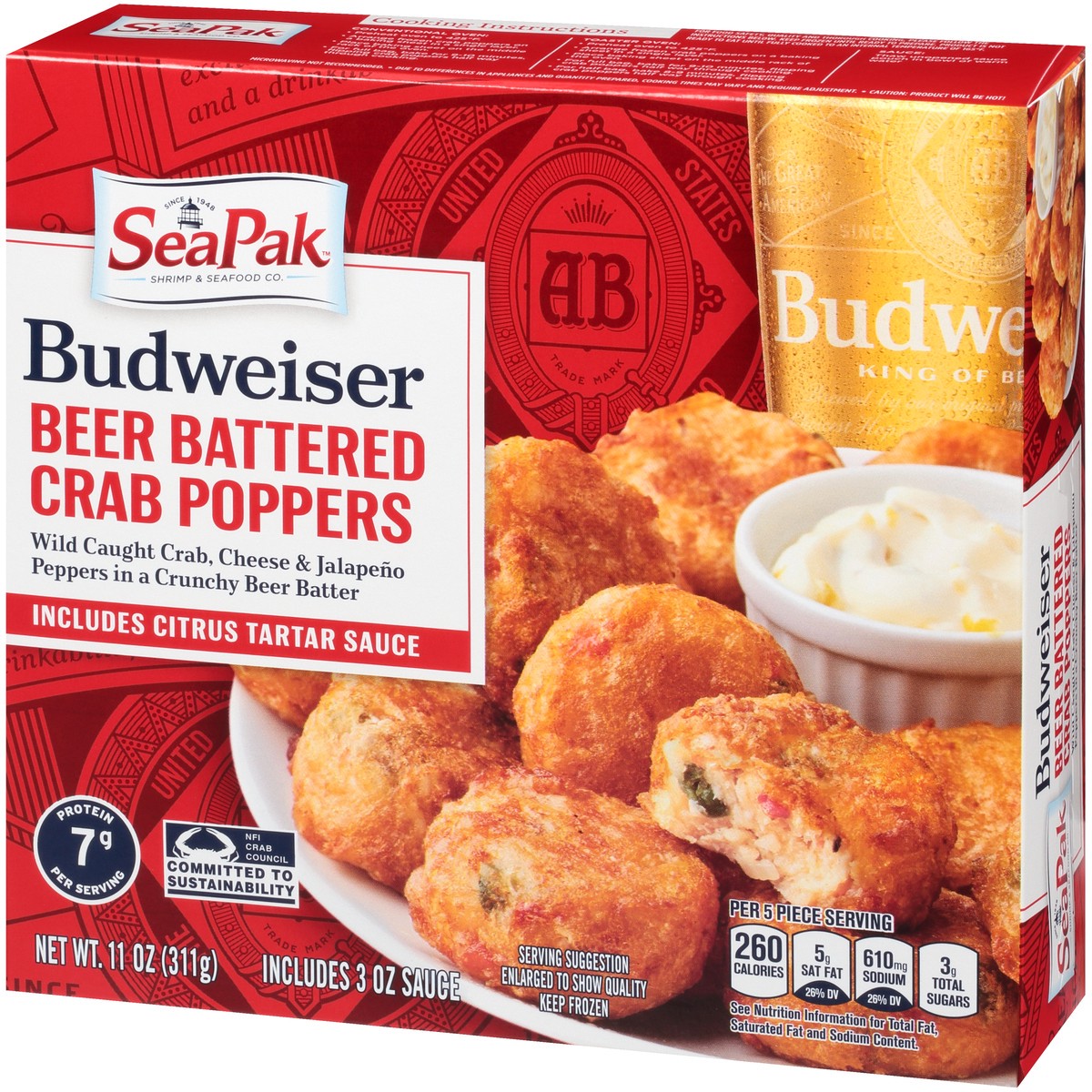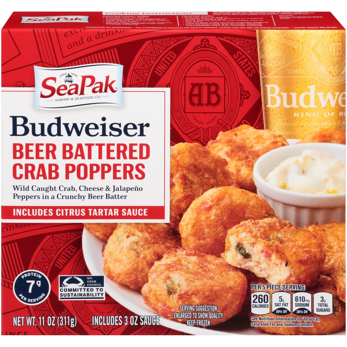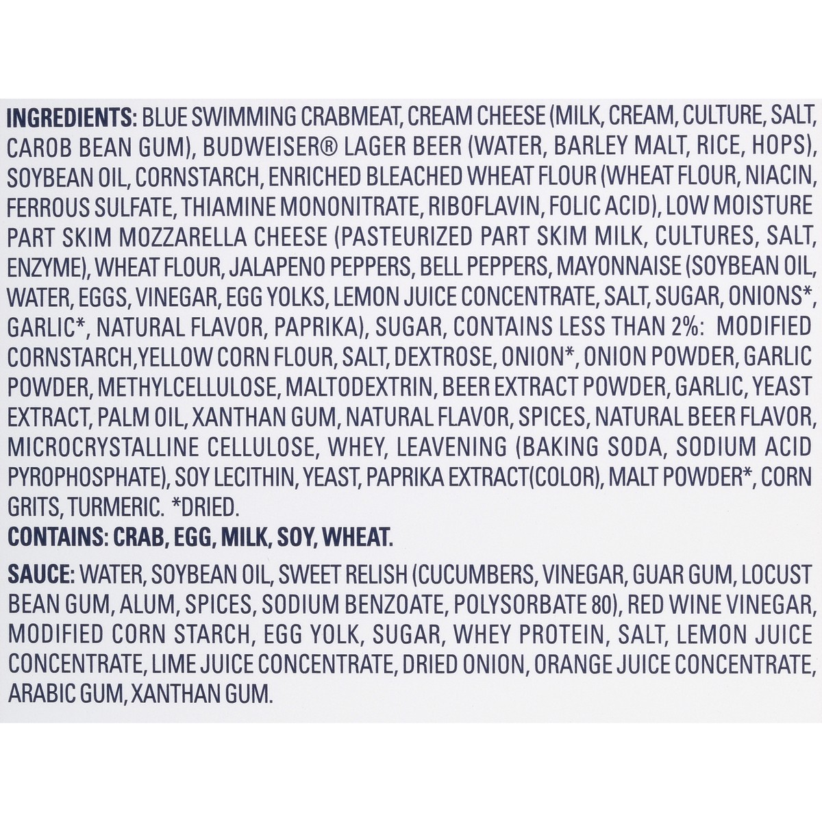 Crab Poppers: Blue Swimming Crabmeat, Cream Cheese (Milk, Cream, Culture, Salt, Carob Bean Gum), Budweiser Lager Beer (Water, Barley Malt, Rice, Hops), Soybean Oil, Cornstarch, Enriched Bleached Wheat…