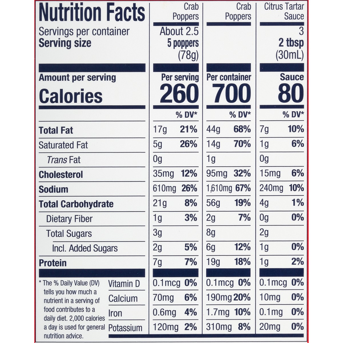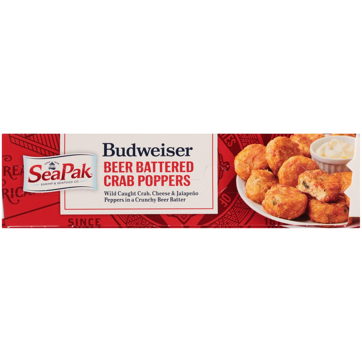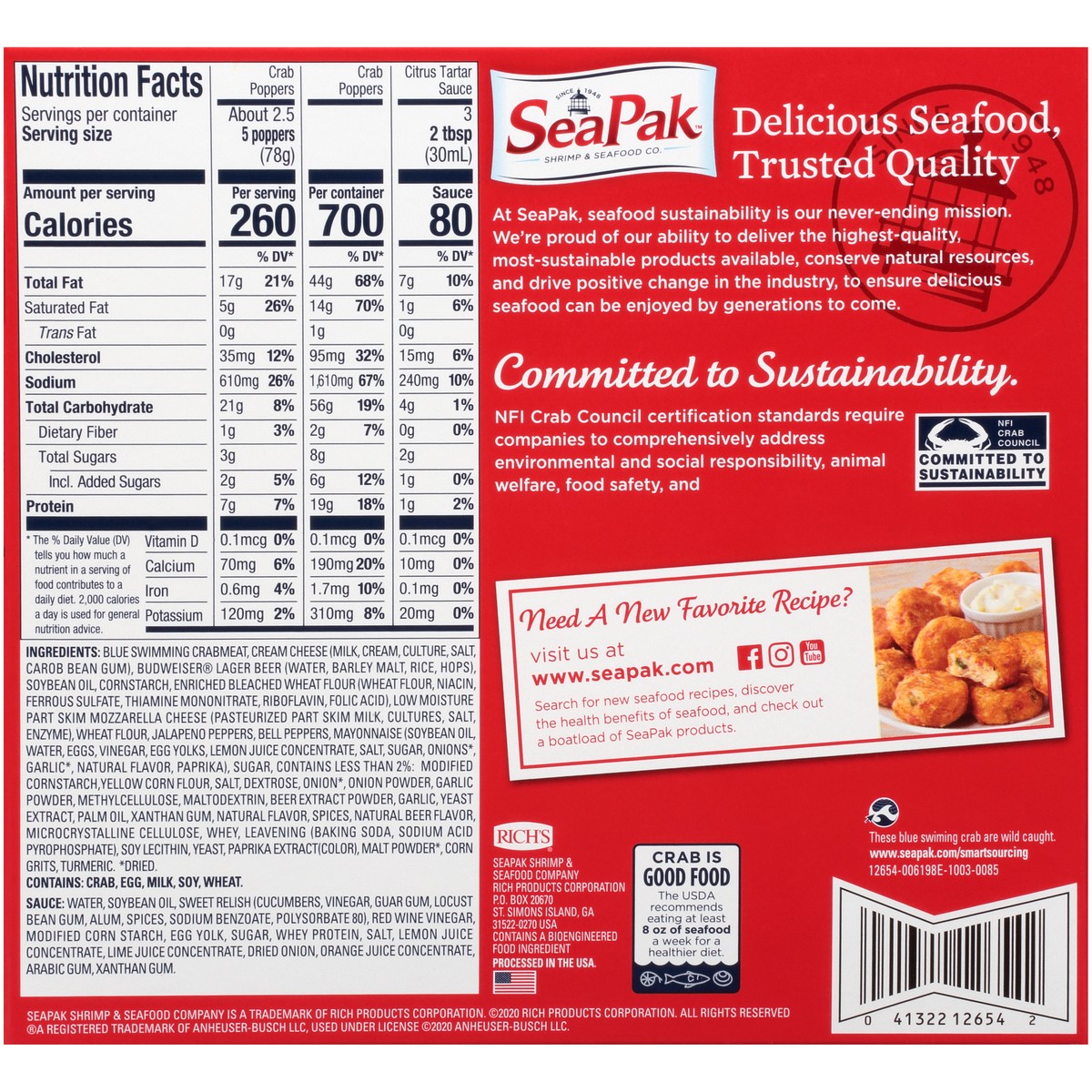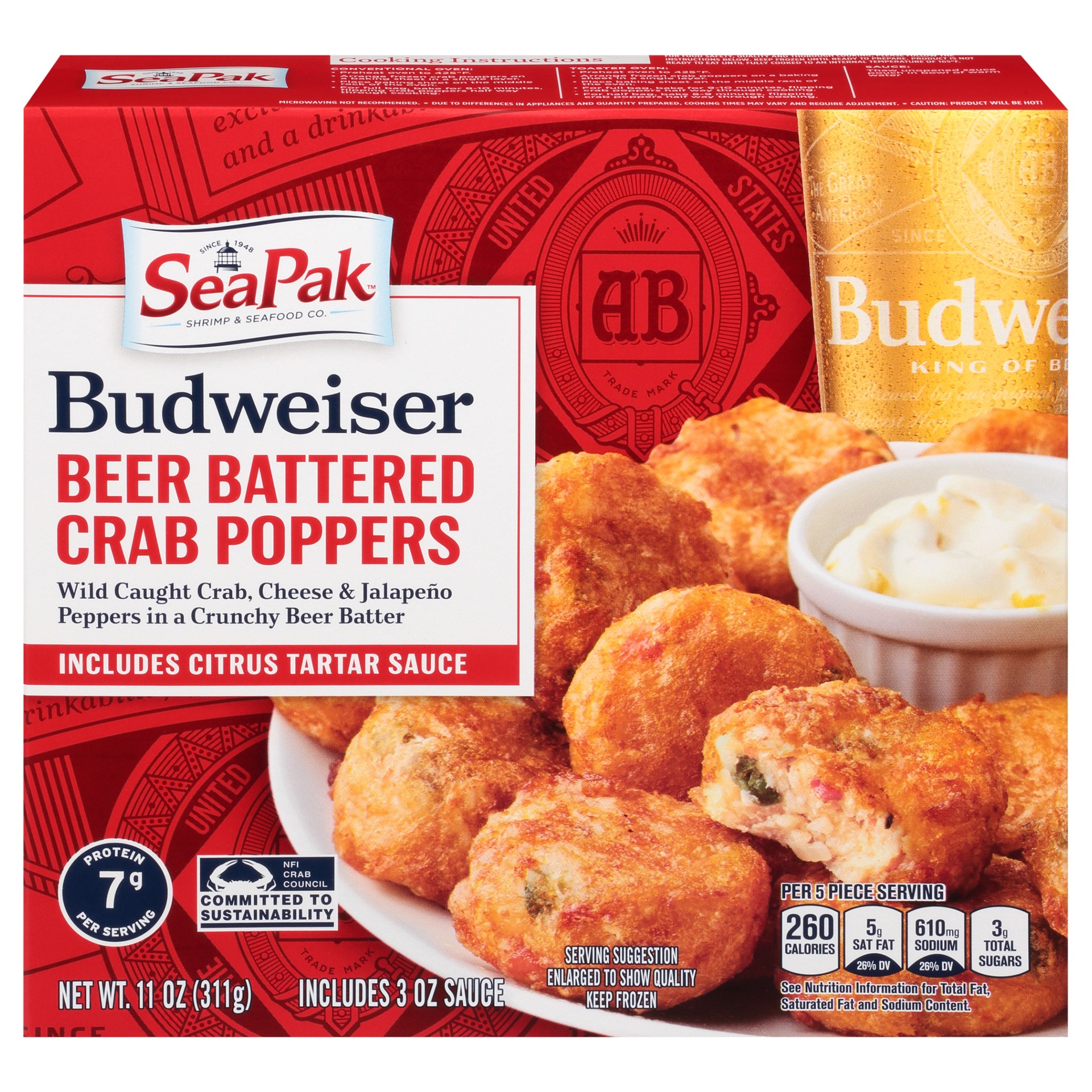 Crab Poppers: Blue Swimming Crabmeat, Cream Cheese (Milk, Cream, Culture, Salt, Carob Bean Gum), Budweiser Lager Beer (Water, Barley Malt, Rice, Hops), Soybean Oil, Cornstarch, Enriched Bleached Wheat…