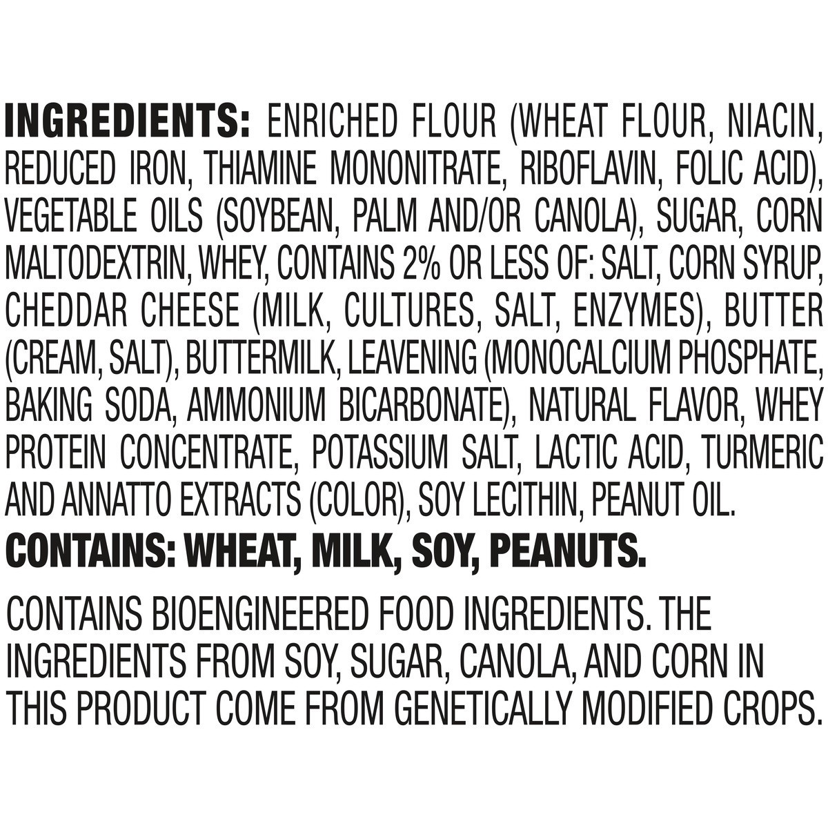 INGREDIENTS: ENRICHED FLOUR (WHEAT FLOUR, NIACIN, REDUCED IRON, THIAMINE MONONITRATE, RIBOFLAVIN, FOLIC ACID), VEGETABLE OILS (SOYBEAN, PALM AND/OR CANOLA), SUGAR, CORN MALTODEXTRIN, WHEY, CONTAINS 2%…