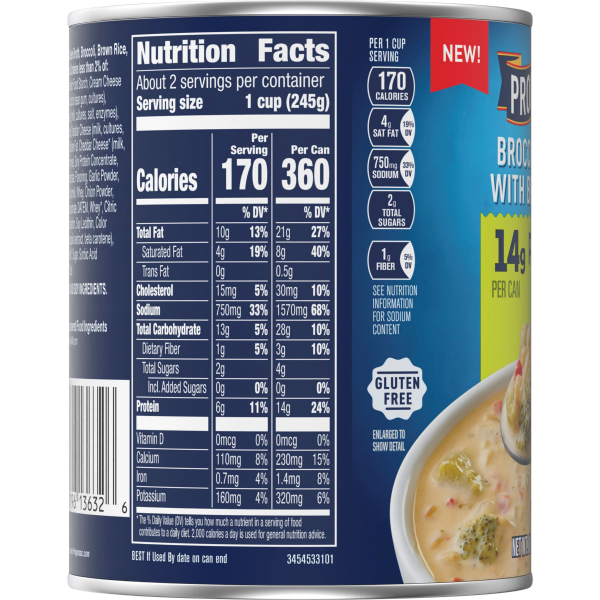 Enjoy protein by the spoonful with Progresso Protein Broccoli Cheese With Brown Rice Soup. This protein broccoli cheese soup has 14g protein in every can. Our comforting gluten free soup recipe featur…
