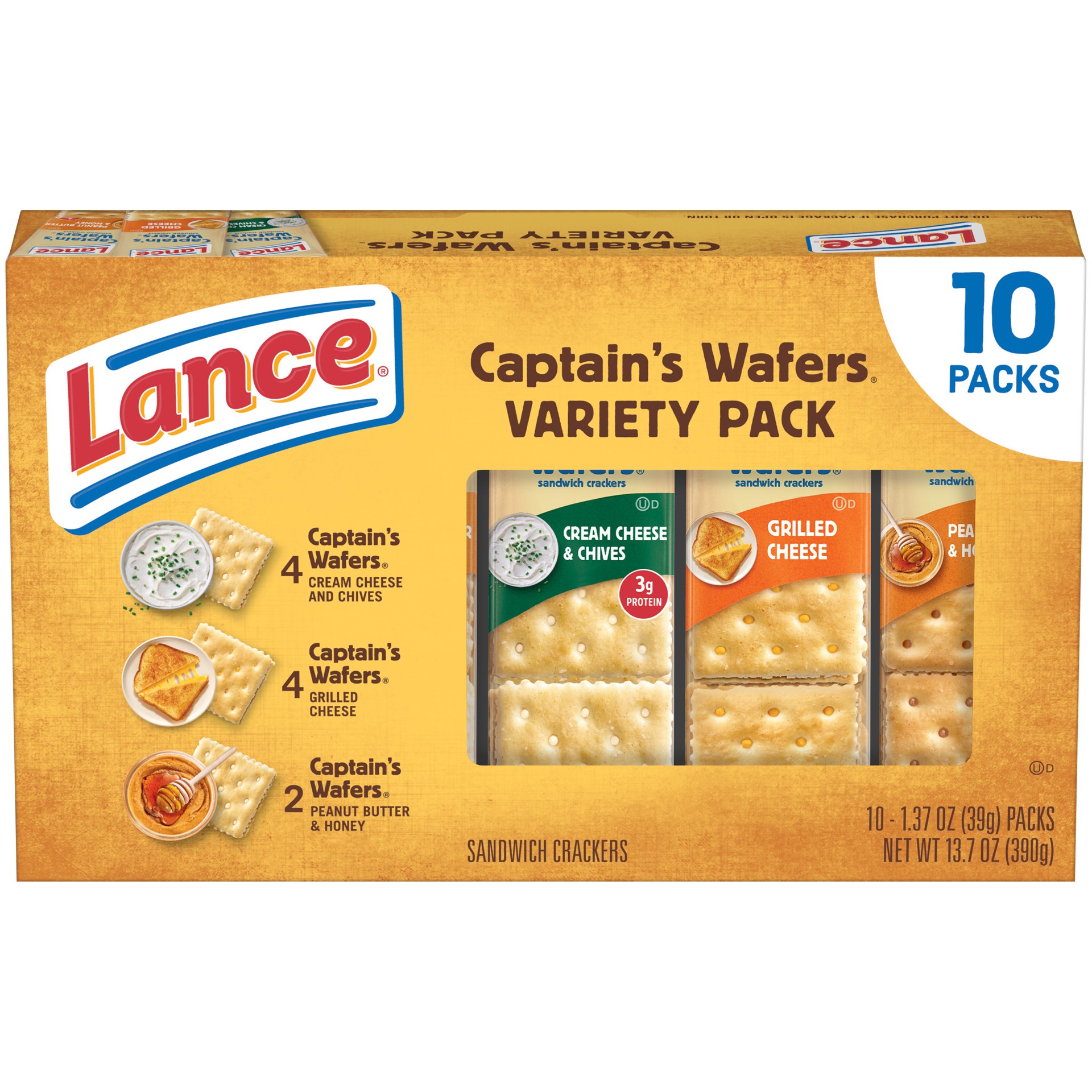 Lance Captain’s Wafers snack lovers won''t be able to get enough of this sandwich cracker variety pack! Three of your favorite flavors with delicious fillings between two crispy classic Captain’s Wafe…