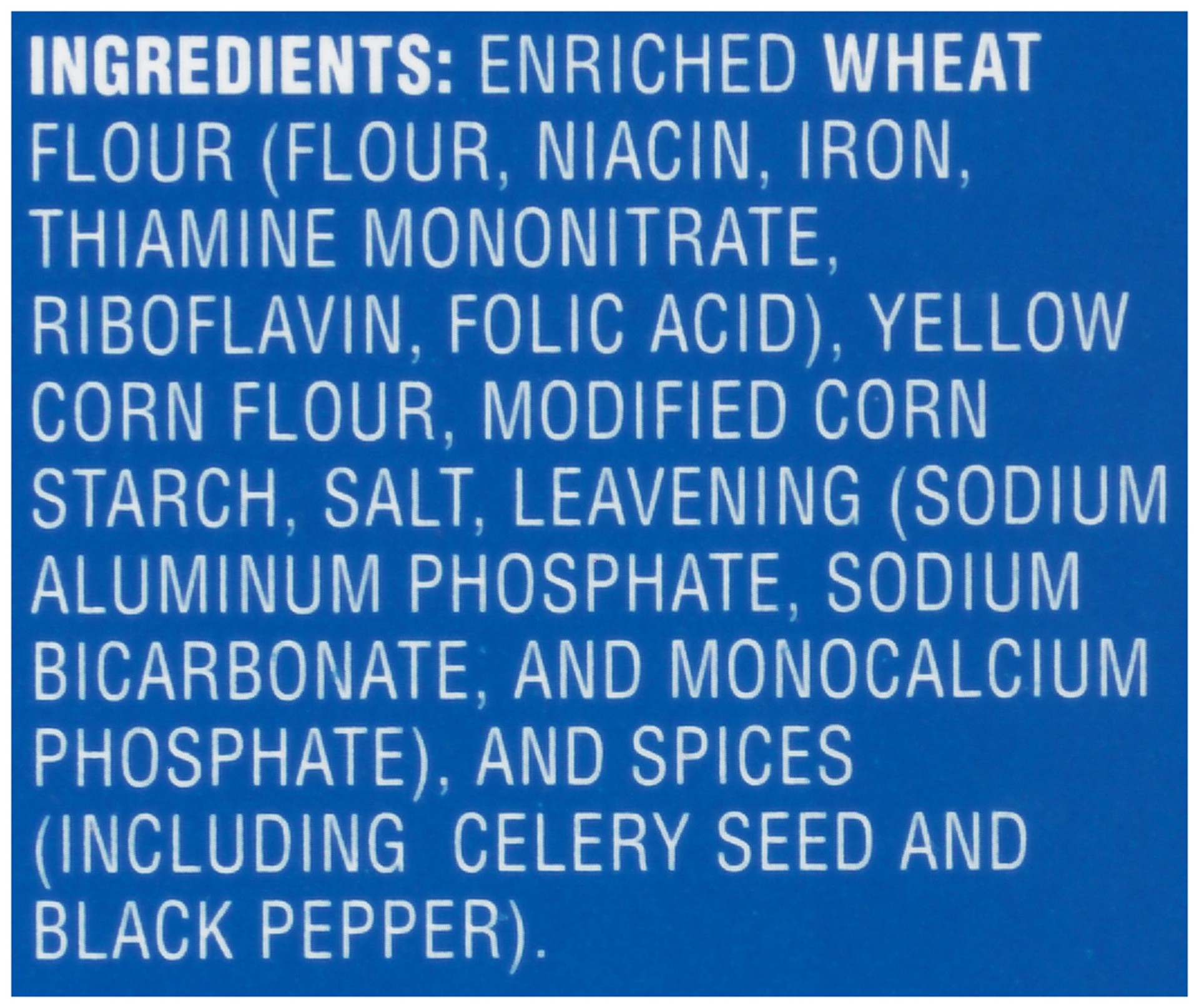 Enriched Wheat Flour (Flour, Niacin, Iron, Thiamine Mononitrate, Riboflavin, Folic Acid), Yellow Corn Flour, Modified Corn Starch, Salt, Leavening (Sodium Aluminum Phosphate, Sodium Bicarbonate, and M…