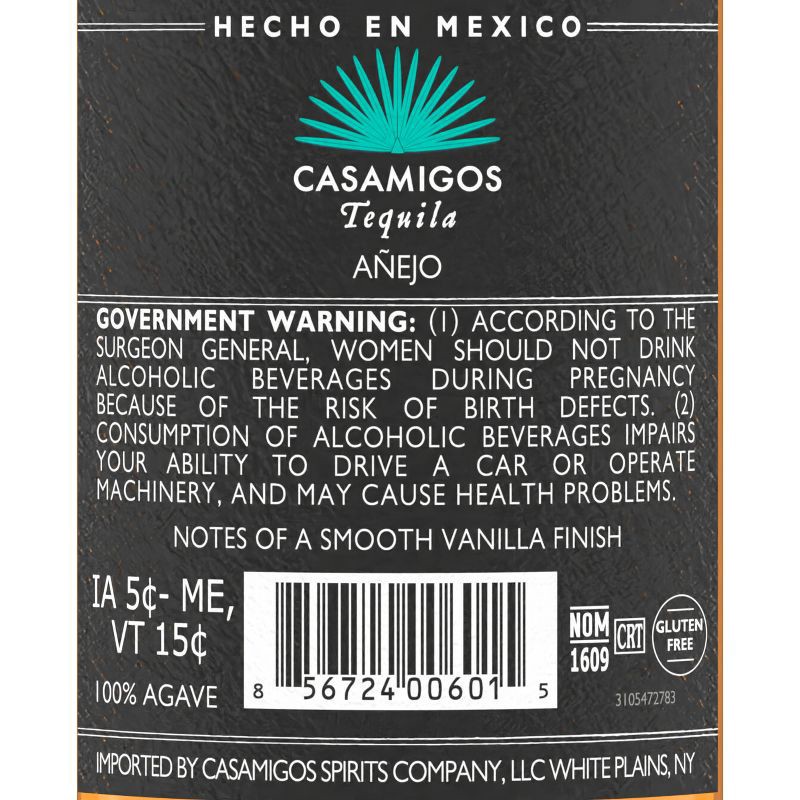 - One 750 mL bottle of Casamigos Anejo Tequila80 proofCasamigos Anejo is the ultimate gift - elegantly crafted and ready to enjoy. With its sleek, minimalist bottle design, it looks as good as it tastes, making it gift-ready straight off the shelfEnjoy it neat, on the rocks, or add it to your favorite cocktailCasamigos Tequilas are made from 100% Blue Weber Agaves that are cultivated in the rich clay soils of Jalisco, Mexico and then hand-selected to ensure the highest qualitySmooth with rich agave sweetness and notes of vanilla and caramel. As it settles, you'll experience layers of cinnamon, roasted nuts, and creamy toffee. The finish is long, with lingering notes of spiced oak and a gentle warmthEnjoy it neat, on the rocks, or add it to your favorite cocktail