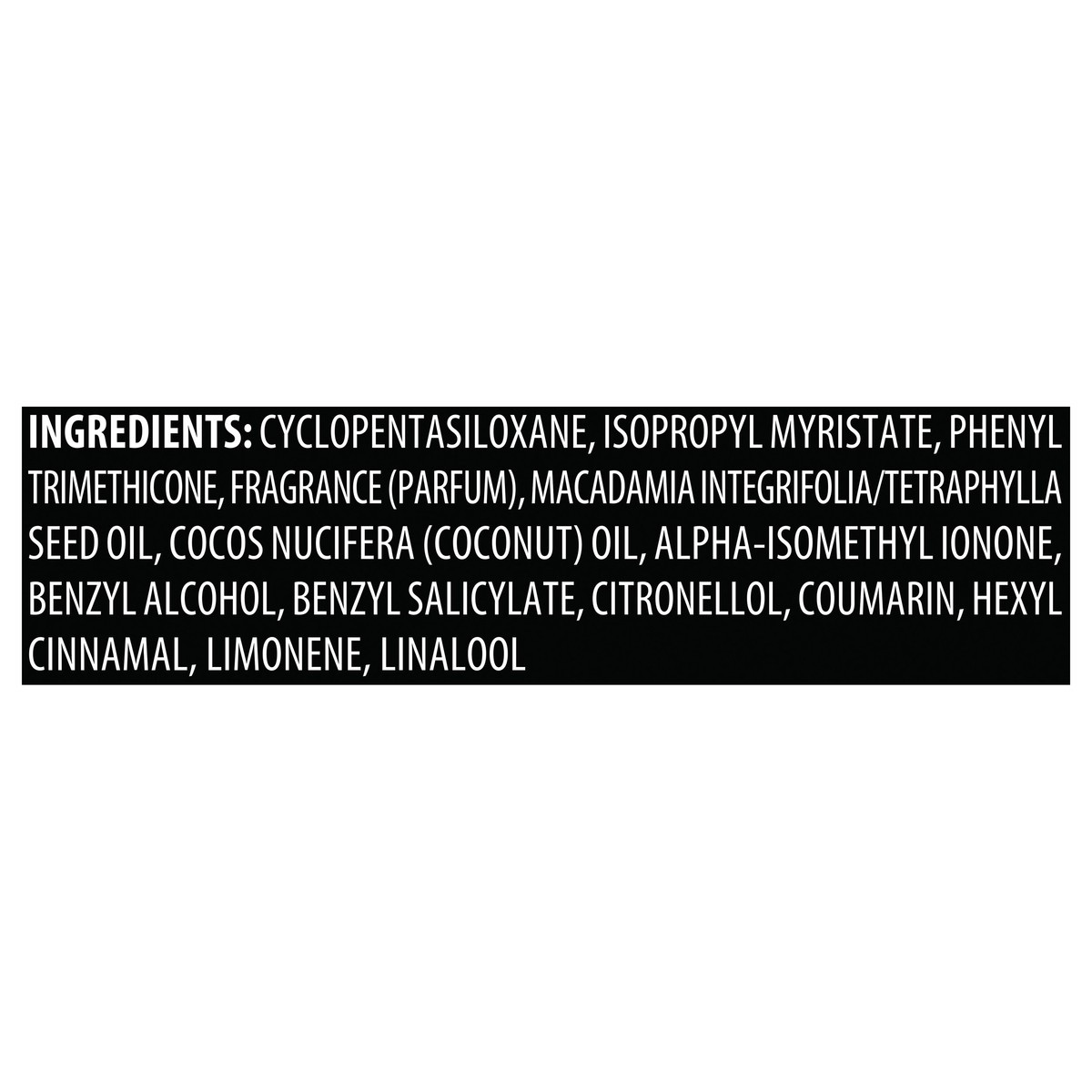 Cyclopentasiloxane, Isopropyl Myristate, Phenyltrimethicone, Fragrance (Parfum), Macadamia Integrifolia/Tetraphylla Seed Oil, Cocos Nucifera (Coconut) Oil, Alpha-Isomethyl Ionone, Benzyl Alcohol, Benz…