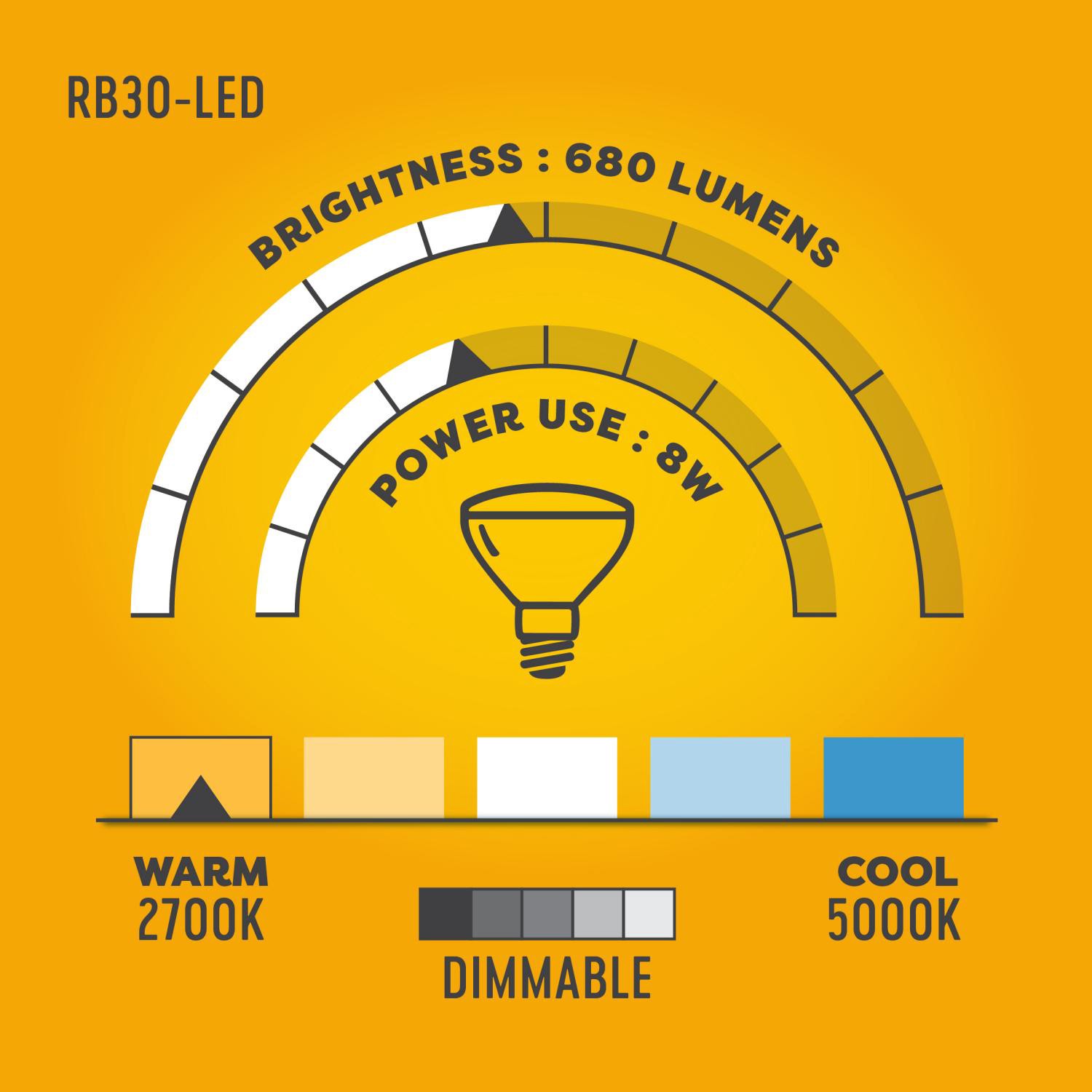 This 8 watt BR30 LED floodlight replaces 65 watt halogen floodlights for over 87% energy savings. 2700K color of light is standard. Great for use in dimming recessed lighting, track lighting and displ…