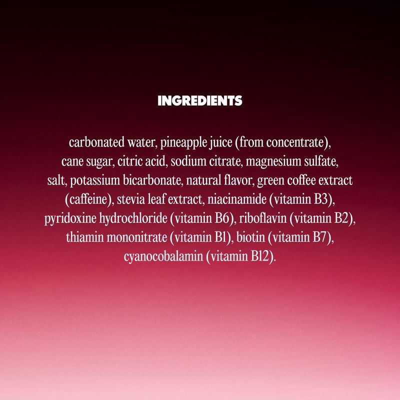 water, pineapple juice (from concentrate), cane sugar, citric acid, sodium citrate, magnesium sulfate, salt, potassium bicarbonate, natural flavor, green coffee extract (caffeine), stevia leaf extract…