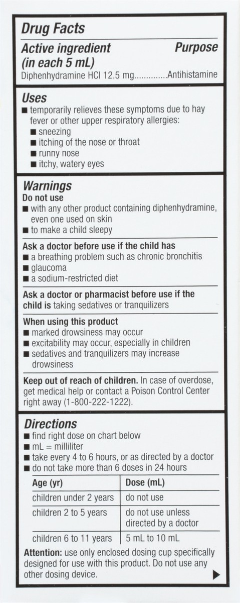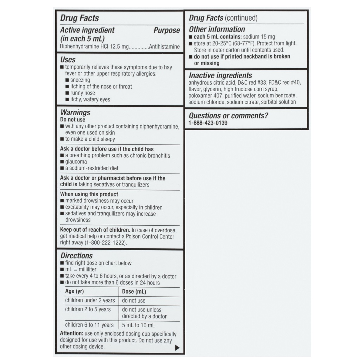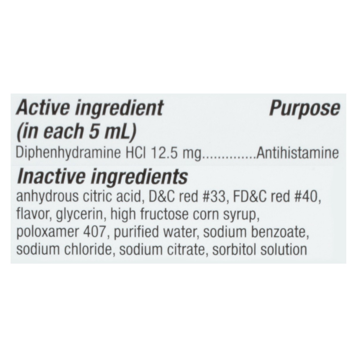 In Each 5 ml Active Ingredients: Diphenhydramine HCI (12.5 mg), Antihistamine. Inactive Ingredients: Anhydrous Citric Acid, D&C Red 33, FD&C Red 40, Flavor, Glycerin, High Fructose Corn Syrup, Poloxam…