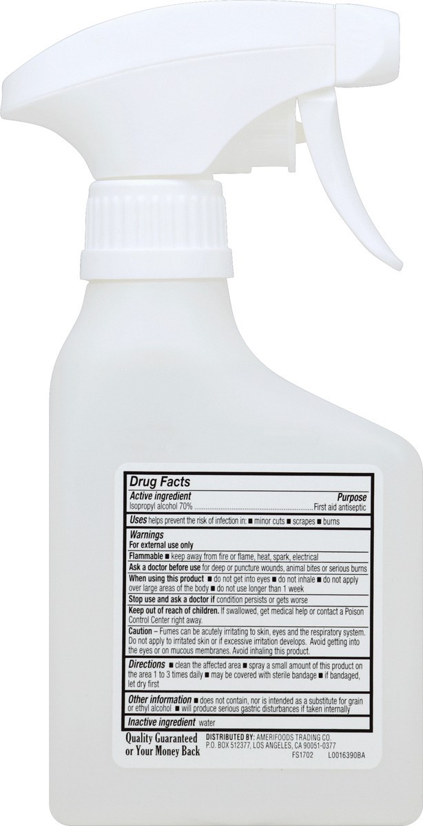 Active Ingredients: Isopropyl Alcohol (70%). Purpose: First Aid Antiseptic. Inactive Ingredients: Water.